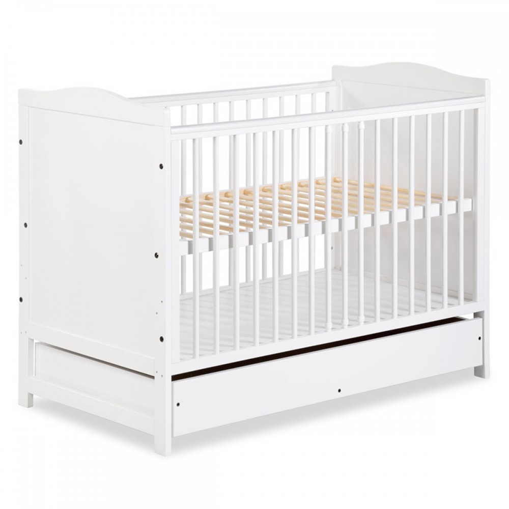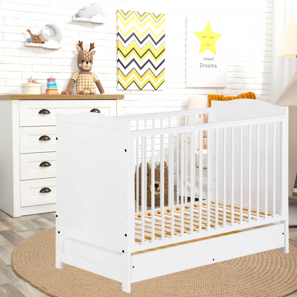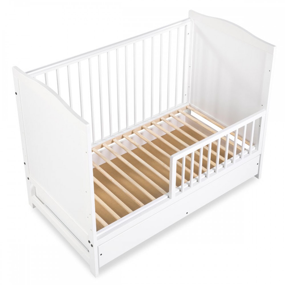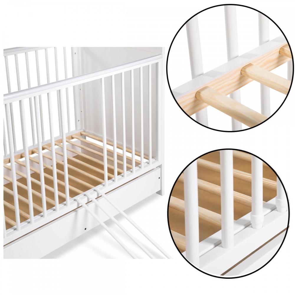 | bulletpointA | Lit évolutif bébé en bois de pin blanc 120x60 cm avec un tiroir équipé de rails coulissants. |