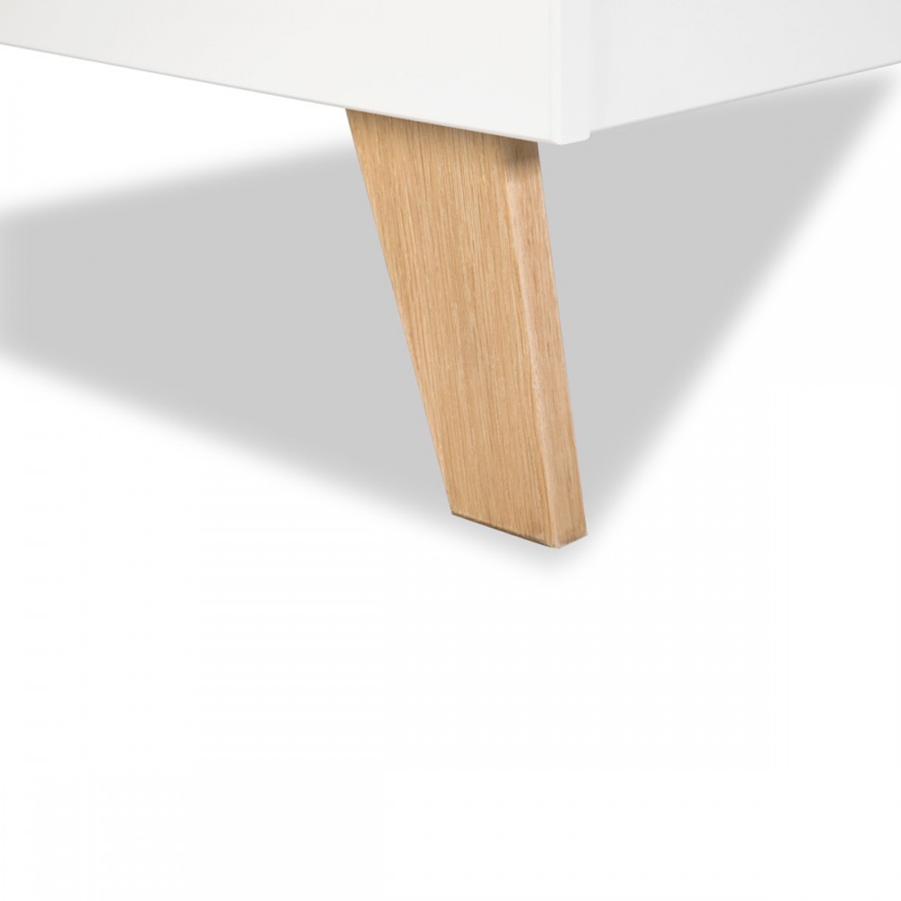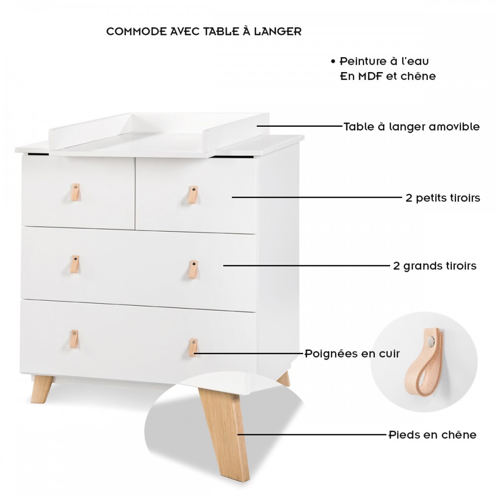 | bulletpointD | Commode avec plateau à langer amovible. 2 grands tiroirs et 2 plus petits avec poignées en cuir. Pieds en chêne. |