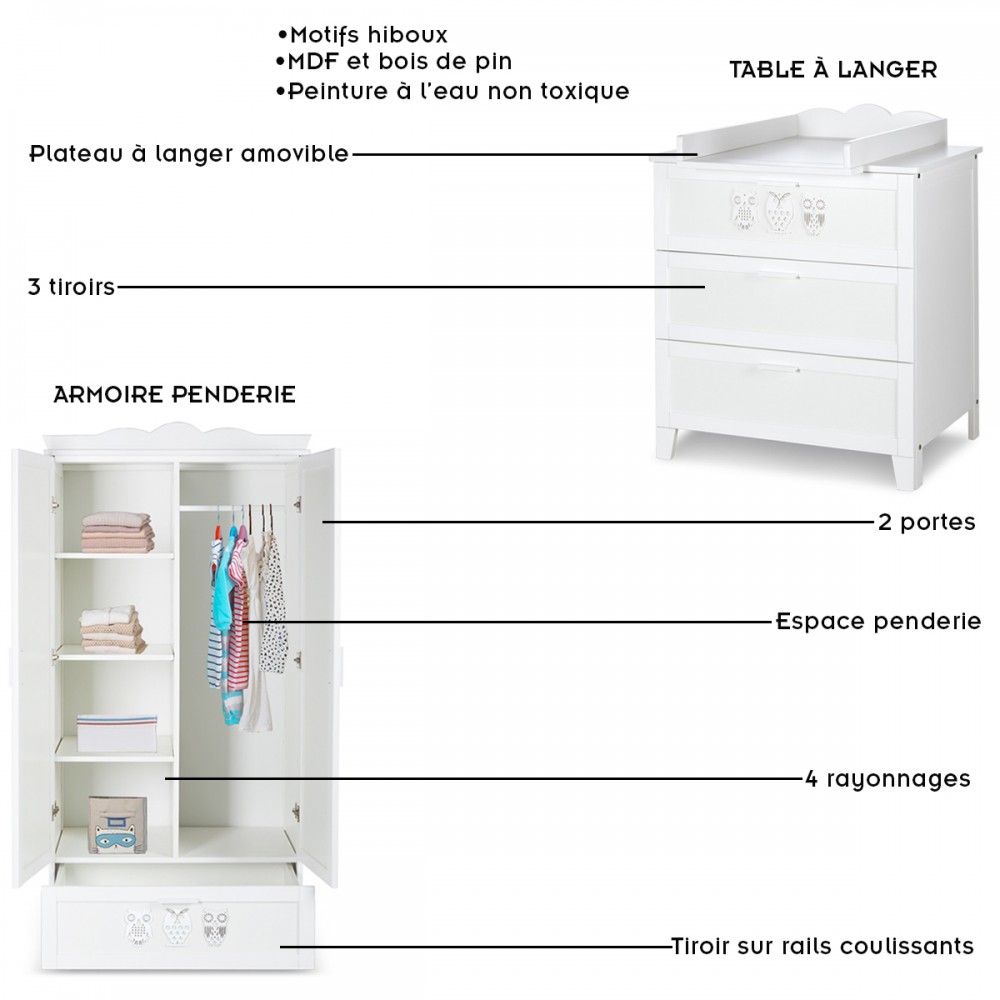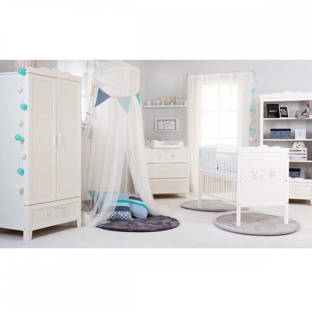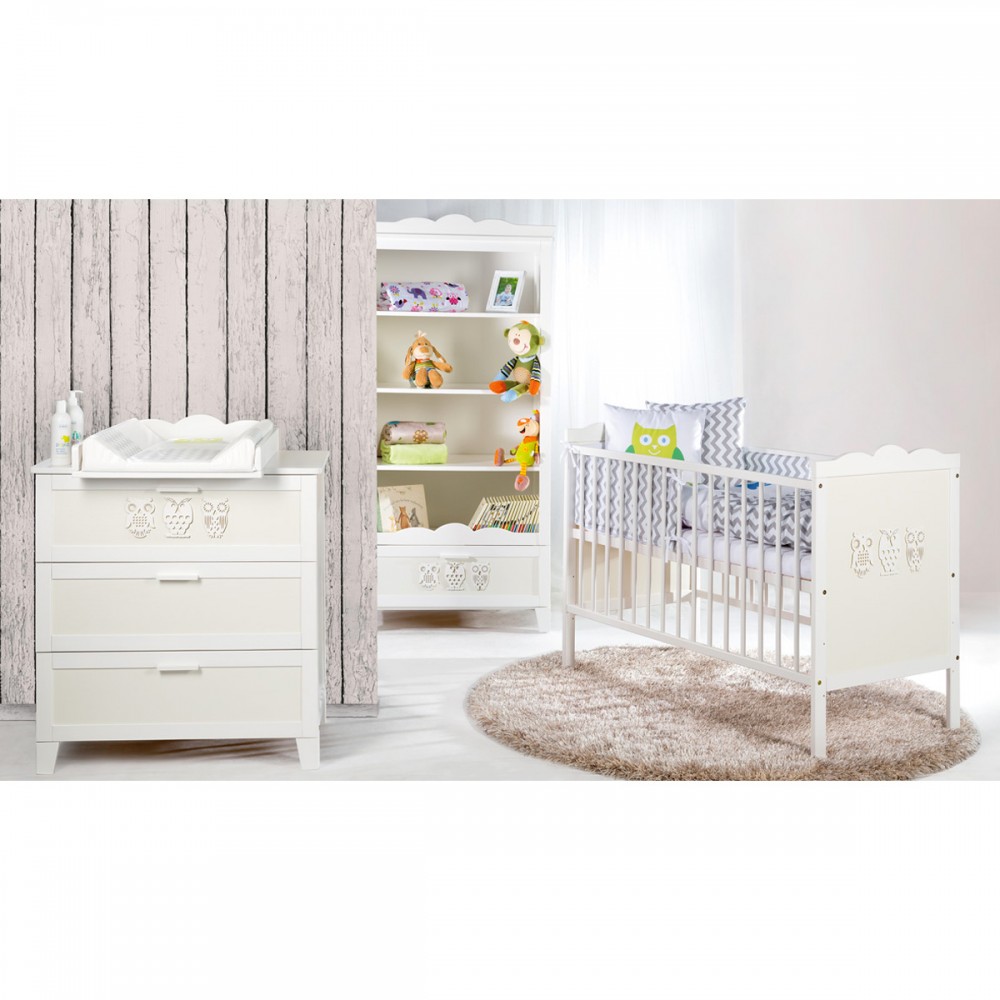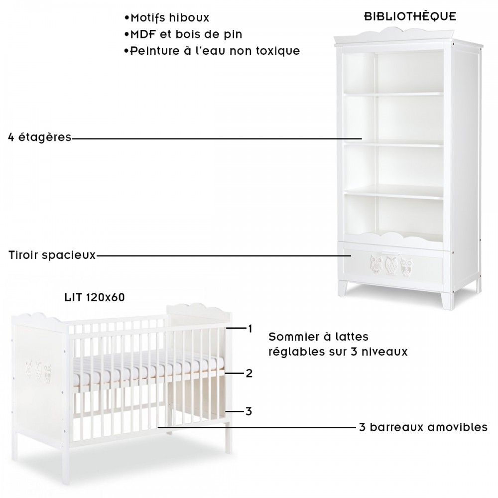 Cet ensemble aux motifs hiboux, composé d’un lit, d’une commode à langer, d’une armoire et d’une bibliothèque, est parfait pour aménager la chambre de votre enfant dans un style doux et chaleureux.