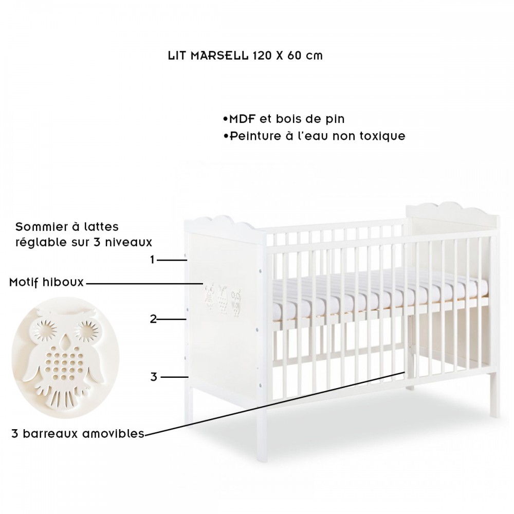 Il s’adapte à la croissance de l’enfant. Son sommier à lattes est réglable sur 3 niveaux (24, 39 et 54 cm). 3 barreaux sont amovibles.