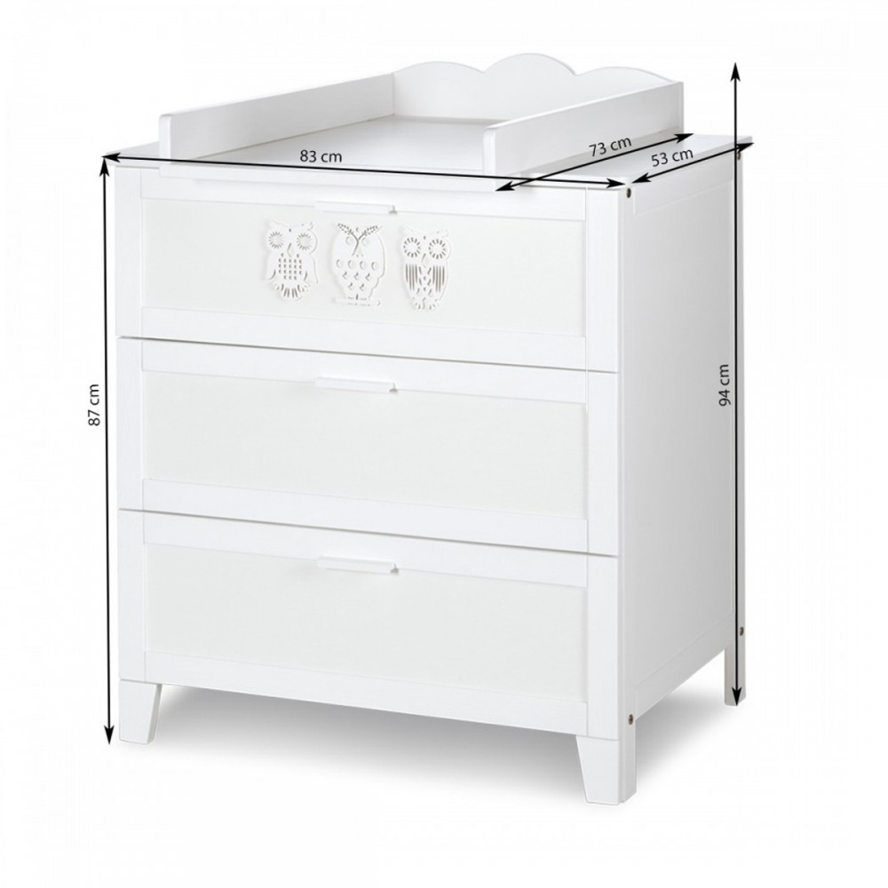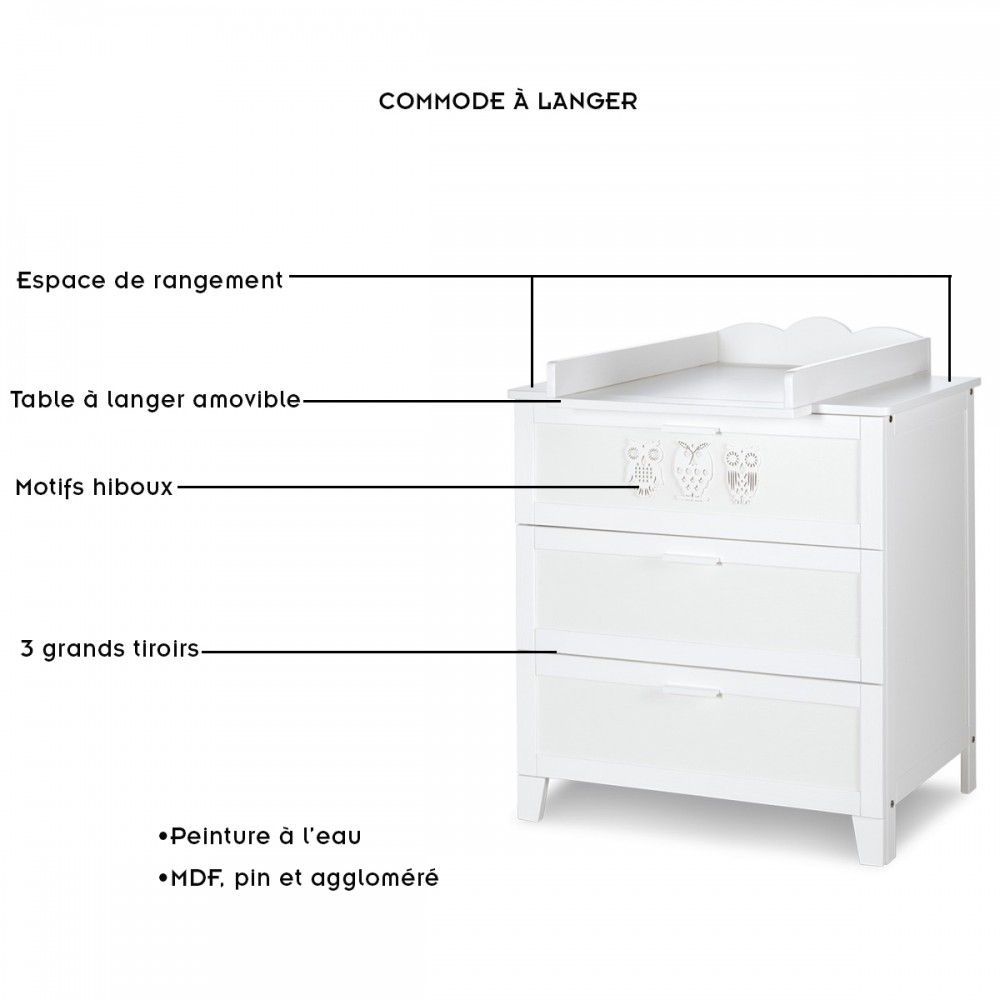 | bulletpointD | Commode 3 tiroirs avec plateau à langer amovible. Fabrication Européenne. À monter. |