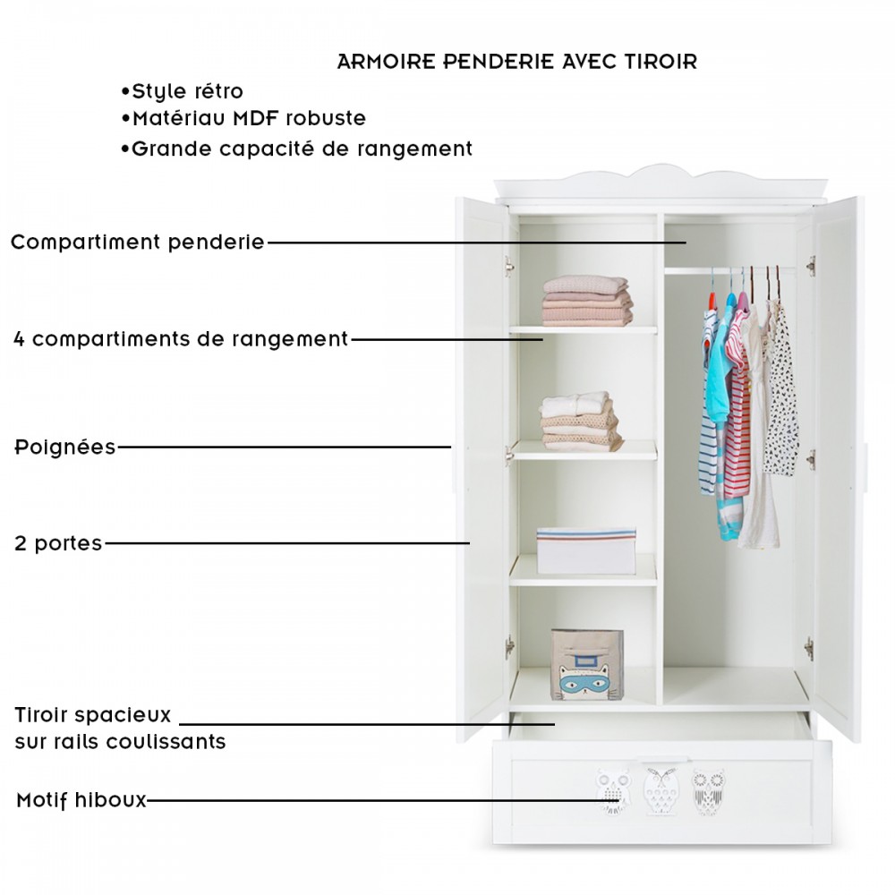 | bulletpointC | Armoire 2 portes, rayonnages, penderie et tiroir. Bibliothèque 4 étagères et tiroir. |