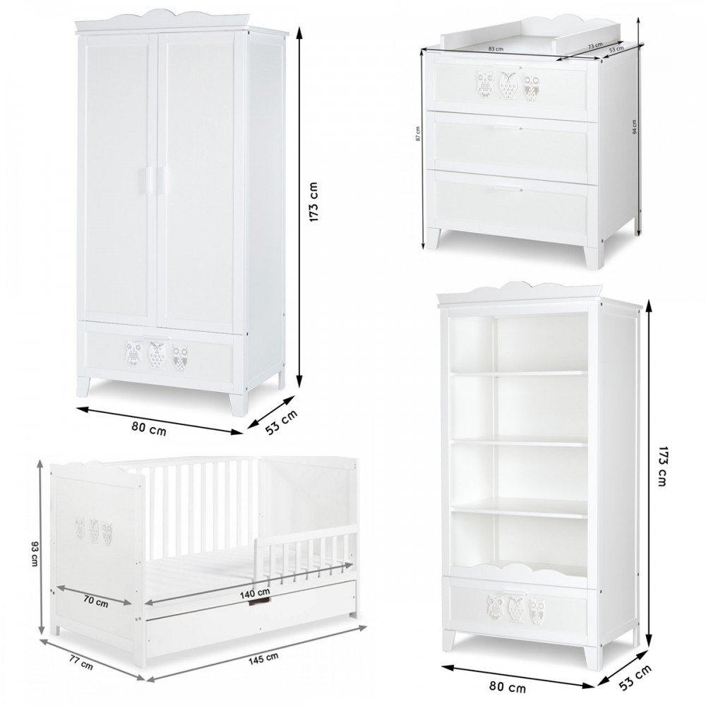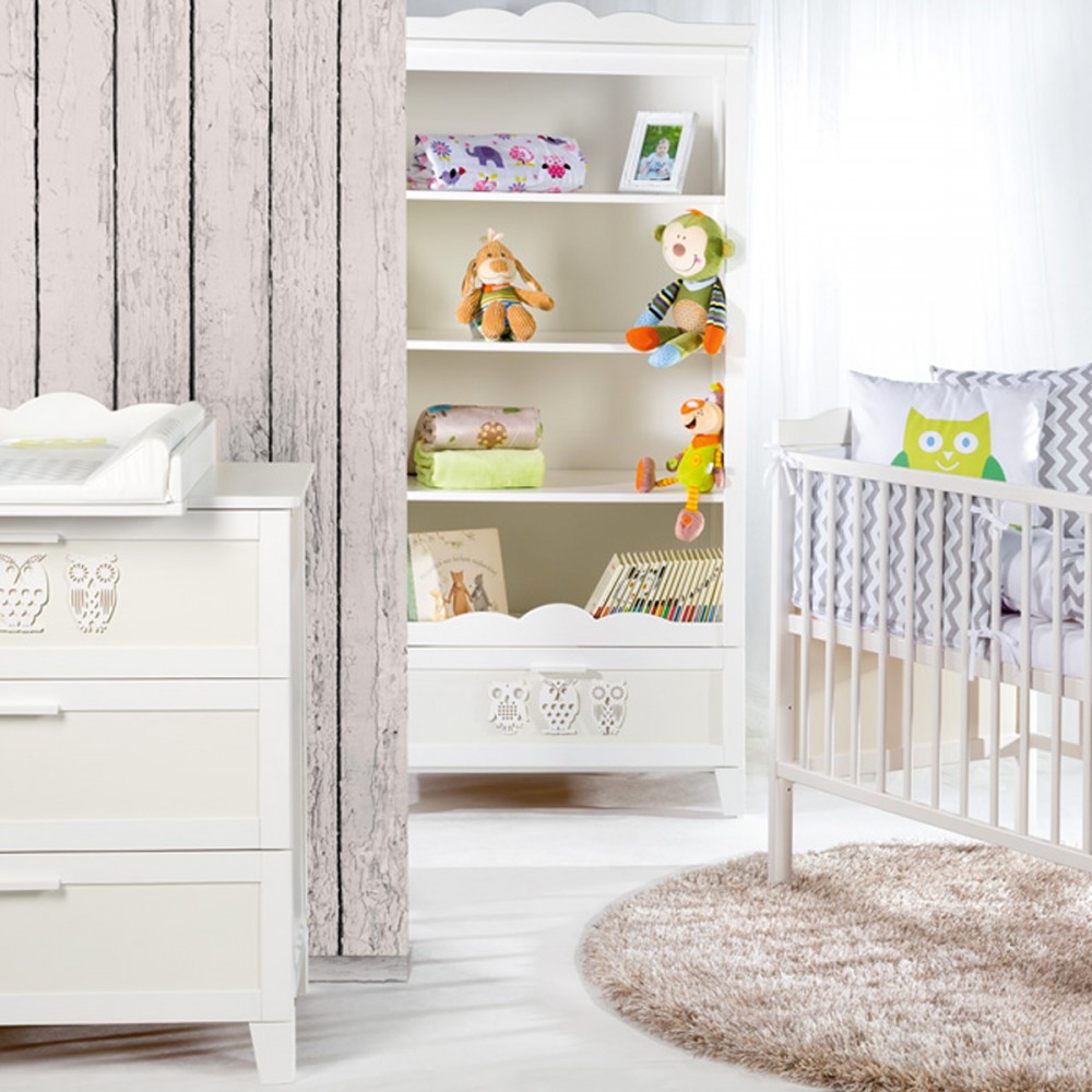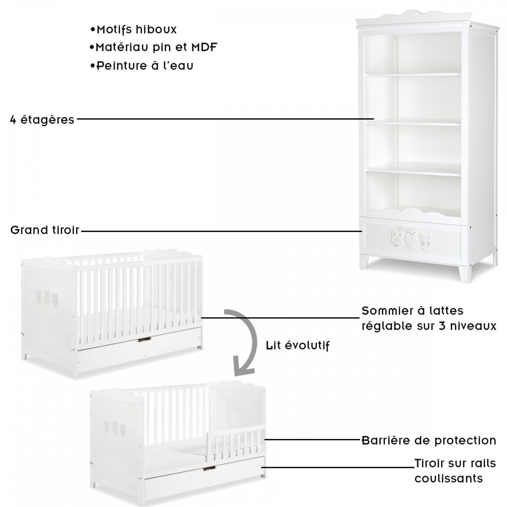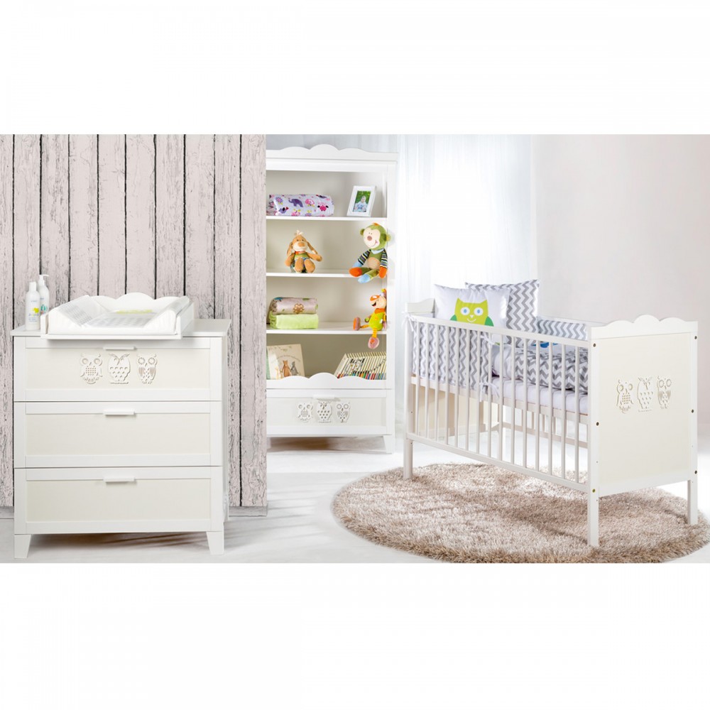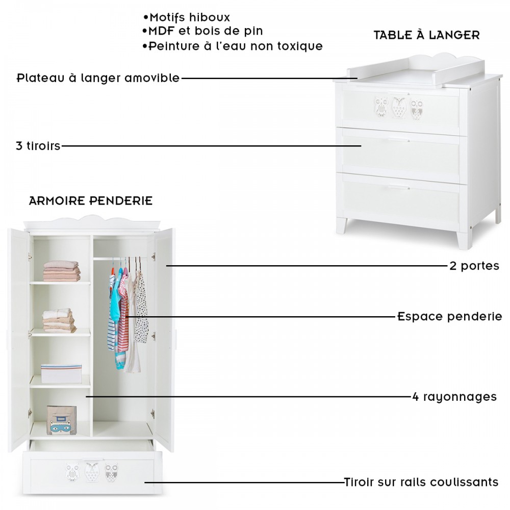 | bulletpointC | Commode avec plateau à langer et 3 tiroirs. Bibliothèque 4 étagères et 1 tiroir. Motifs hiboux sur chaque meuble. |