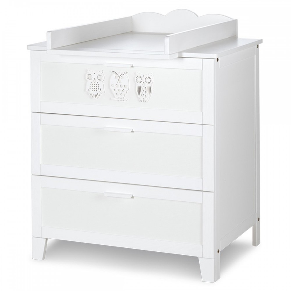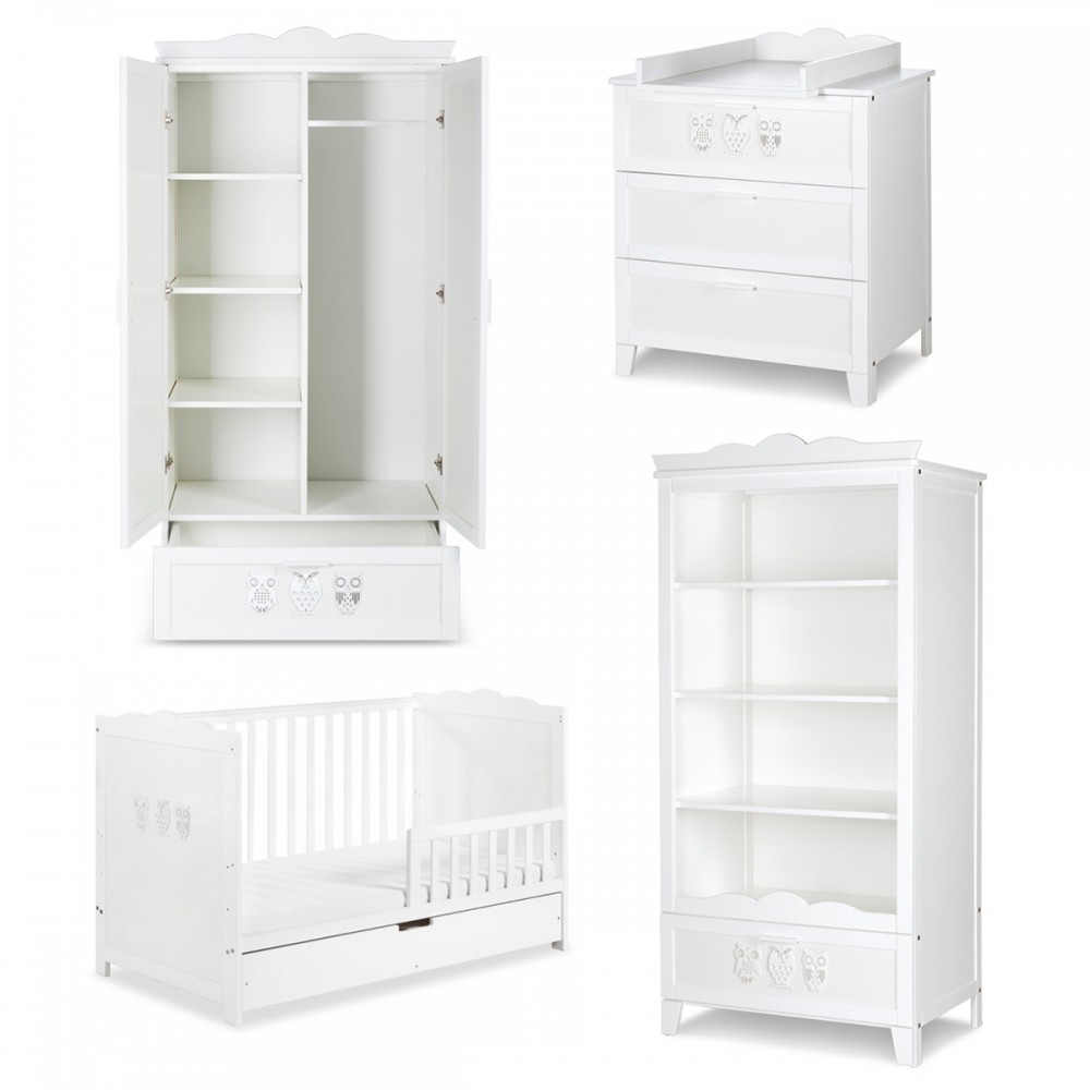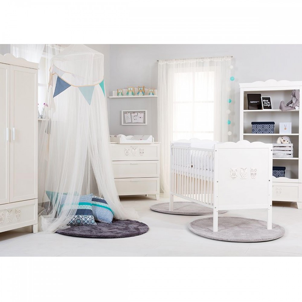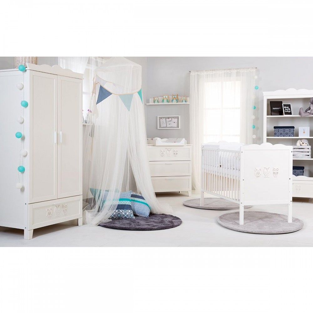 | bulletpointC | Commode avec plateau à langer et 3 tiroirs. Bibliothèque 4 étagères et 1 tiroir. Motifs hiboux sur chaque meuble. |