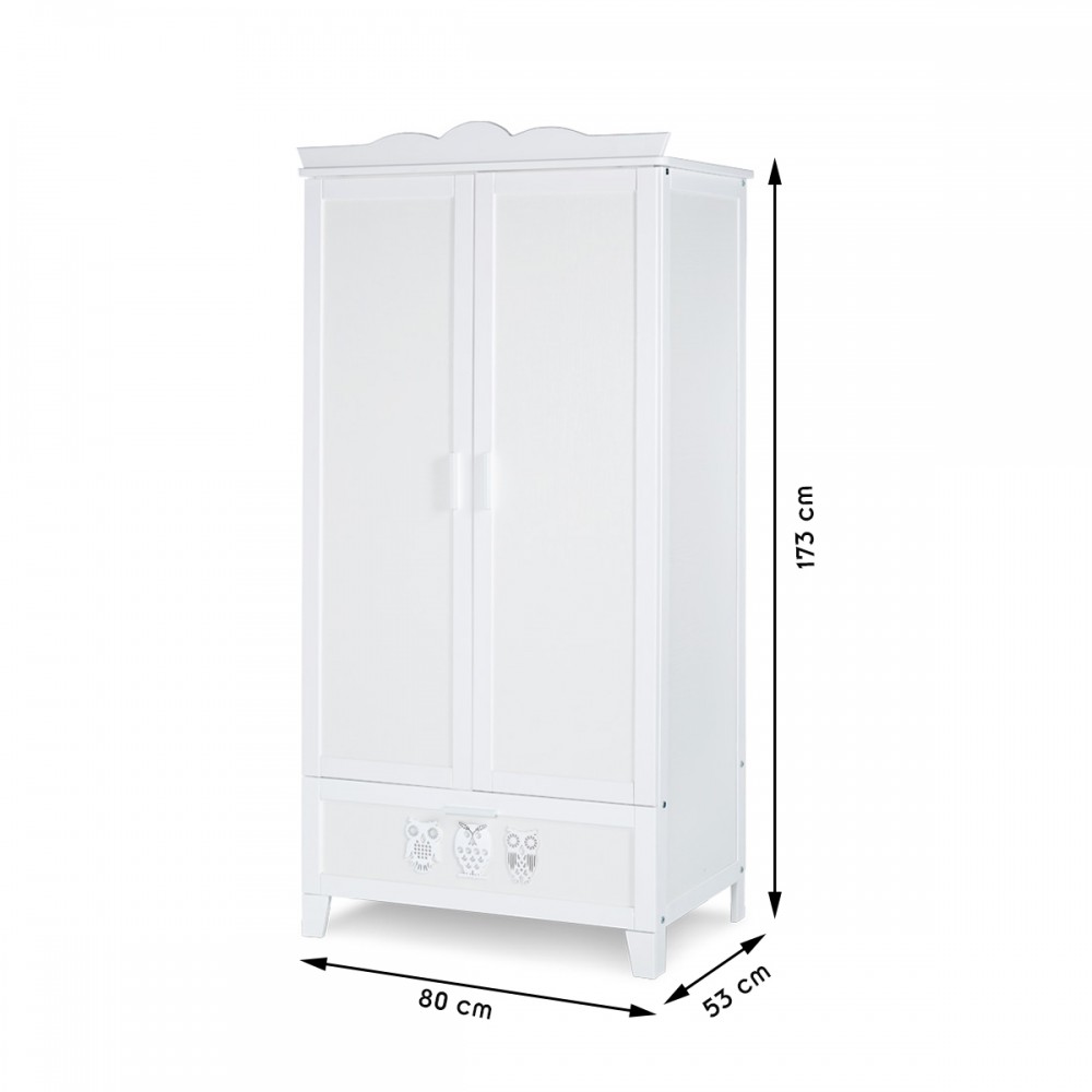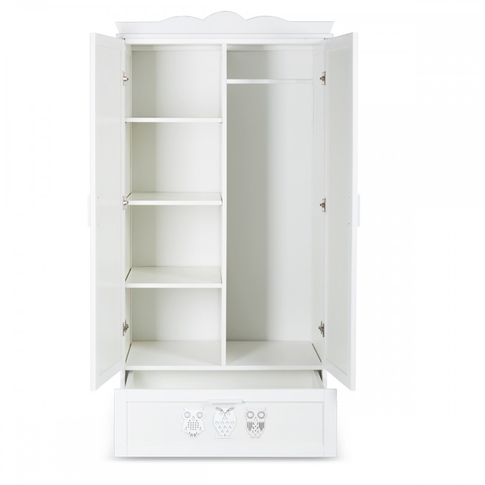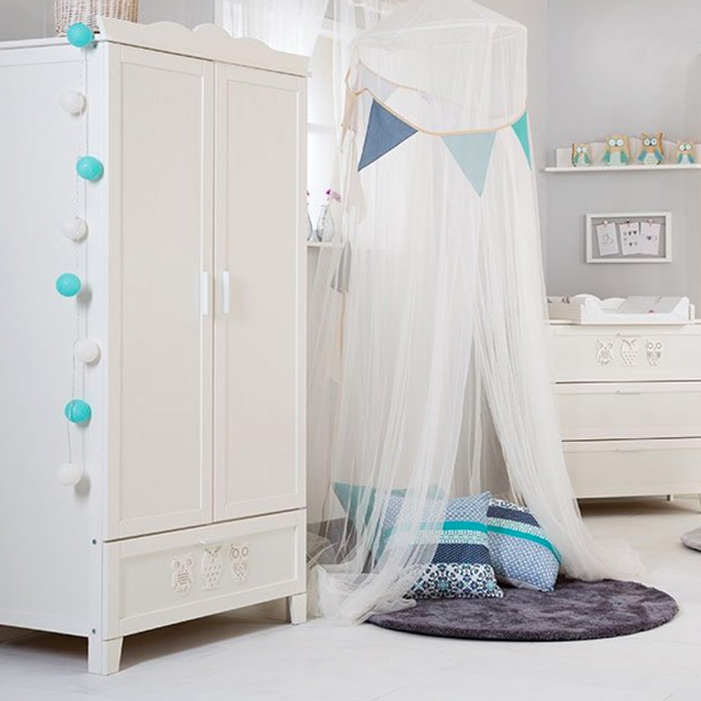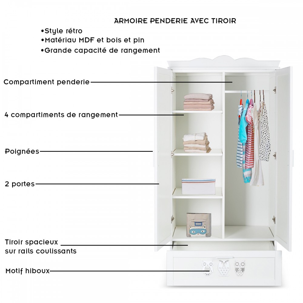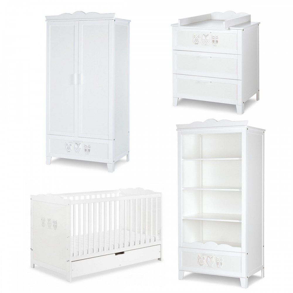 | bulletpointC | Commode avec plateau à langer et 3 tiroirs. Bibliothèque 4 étagères et 1 tiroir. Motifs hiboux sur chaque meuble. |