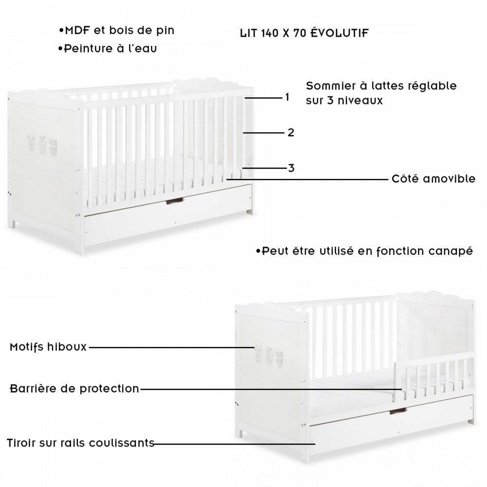 Lit à barreaux évolutif 140 cm x 70 cm