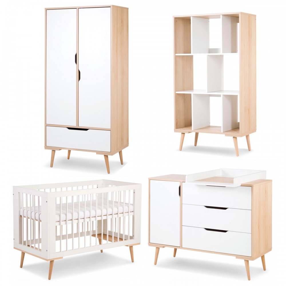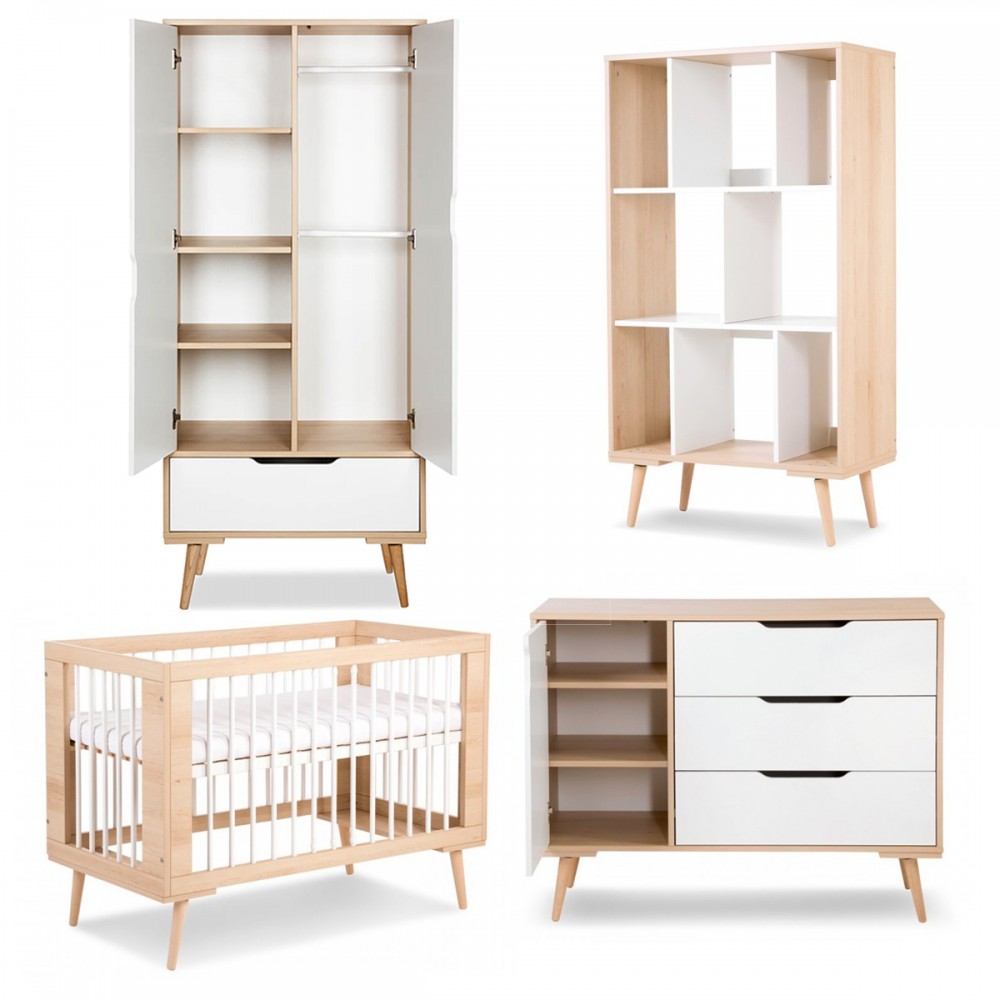Cette chambre d’enfant de style scandinave est composée d’une commode à langer, d’une armoire, d’une bibliothèque et d’un lit.