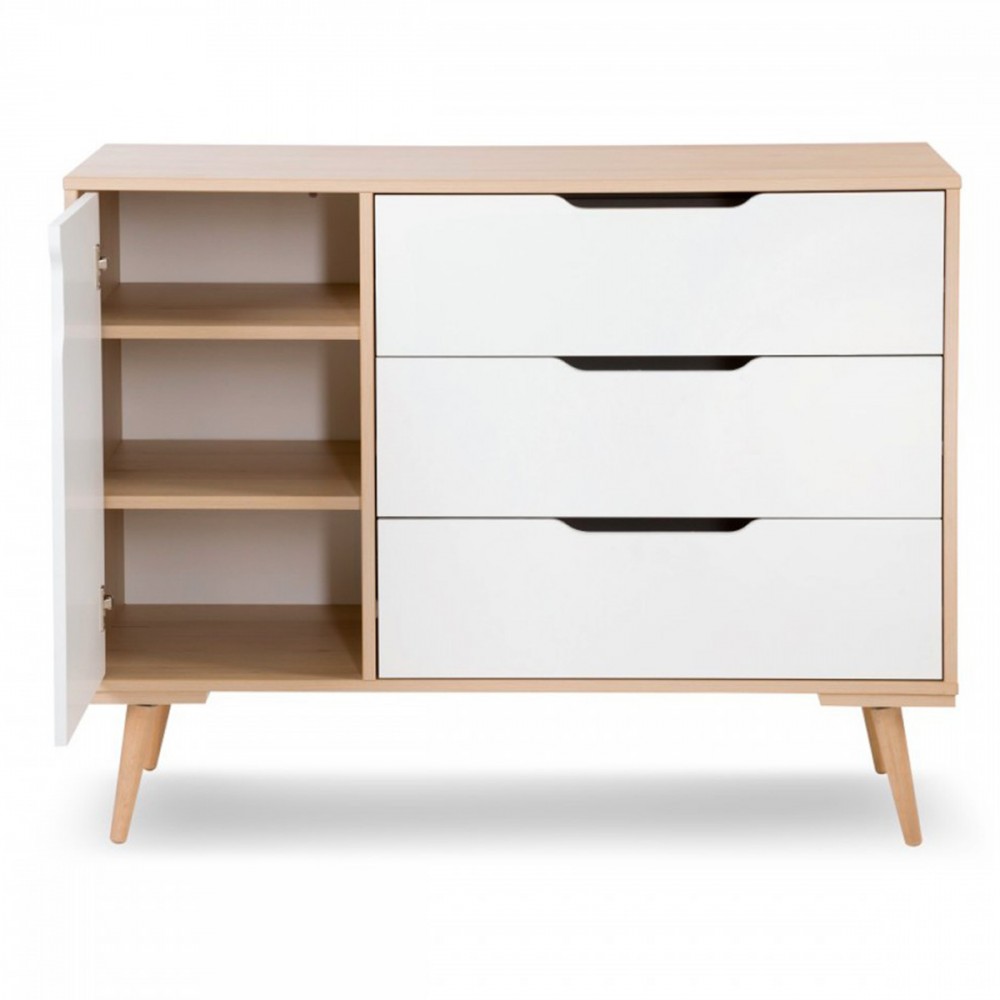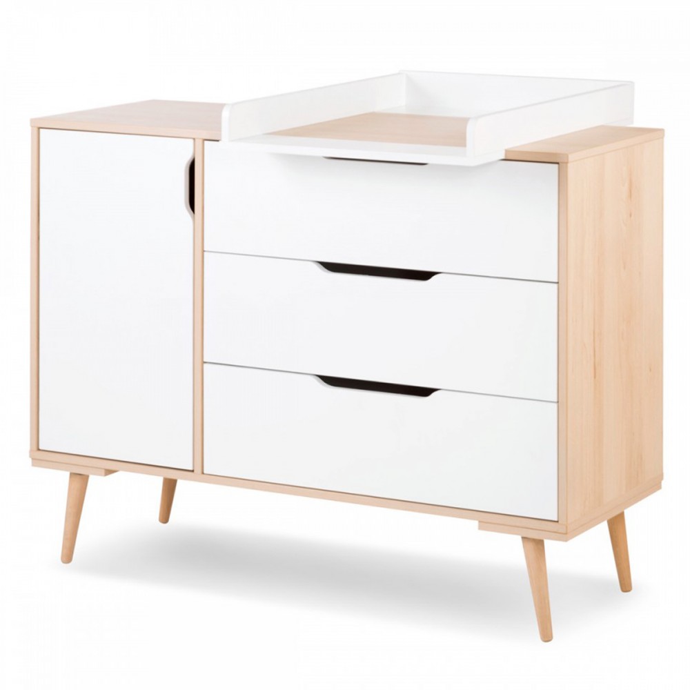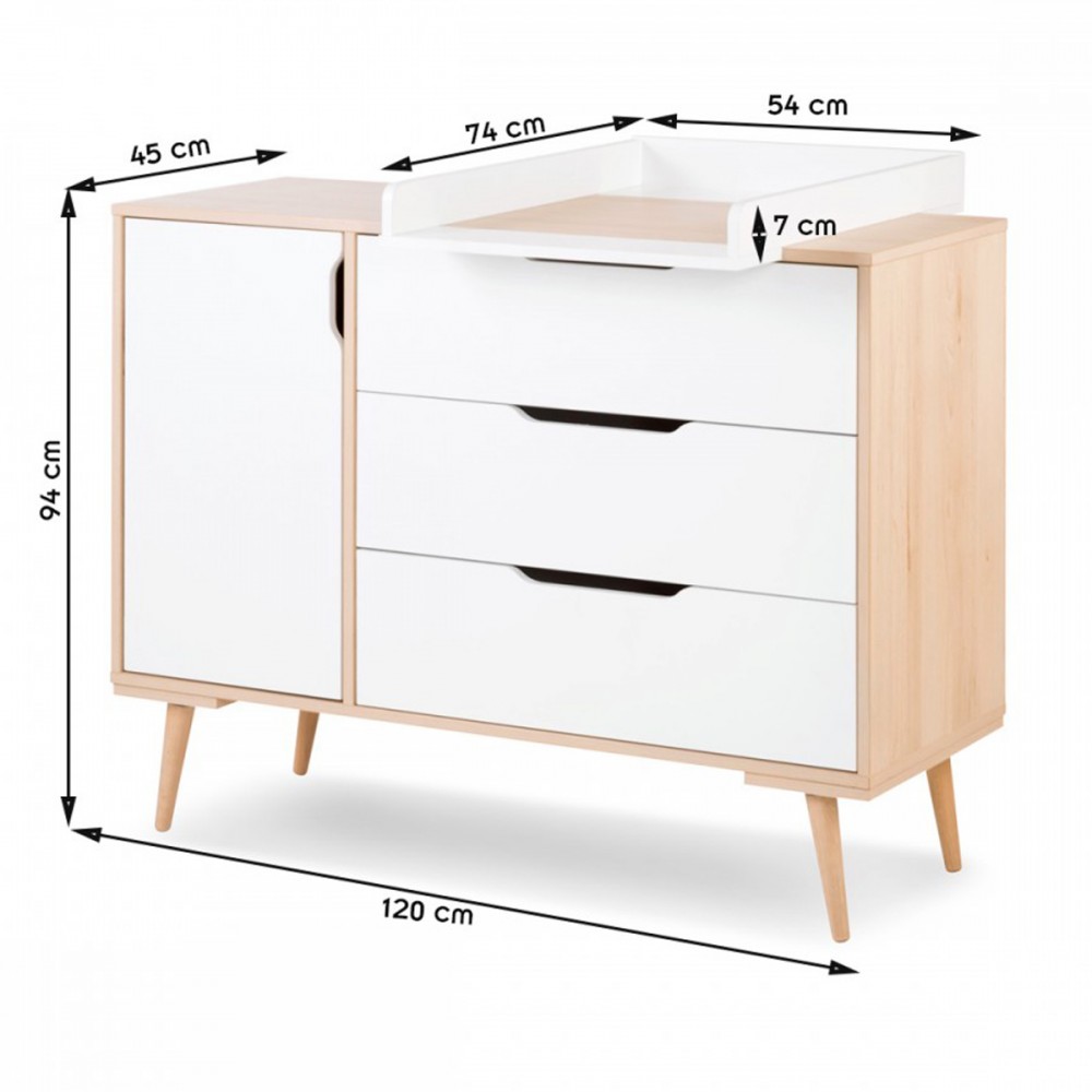 | bulletpointD | Commode avec plateau à langer amovible. Grand espace de rangement et porte avec étagères. Meubles avec pieds en hêtre. |