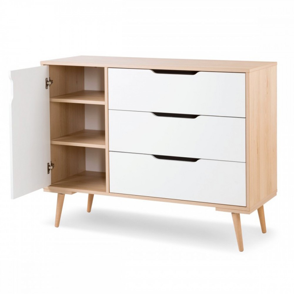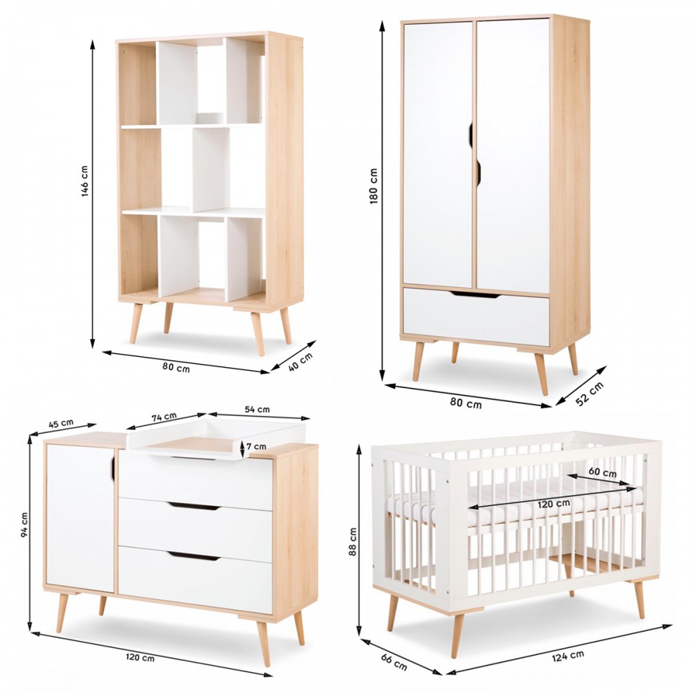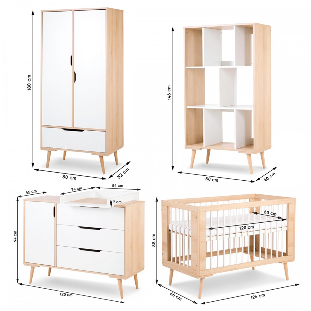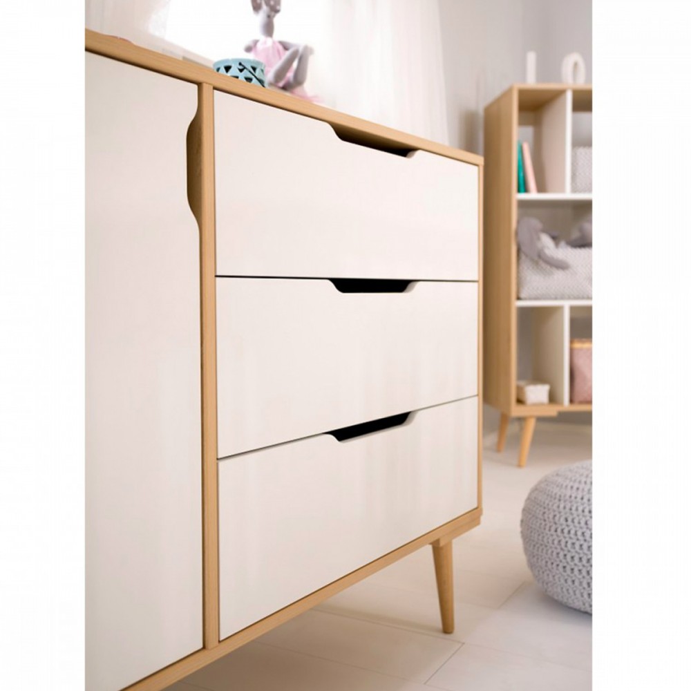 | bulletpointD | Commode avec plateau à langer amovible. Grand espace de rangement et porte avec étagères. Meubles avec pieds en hêtre. |