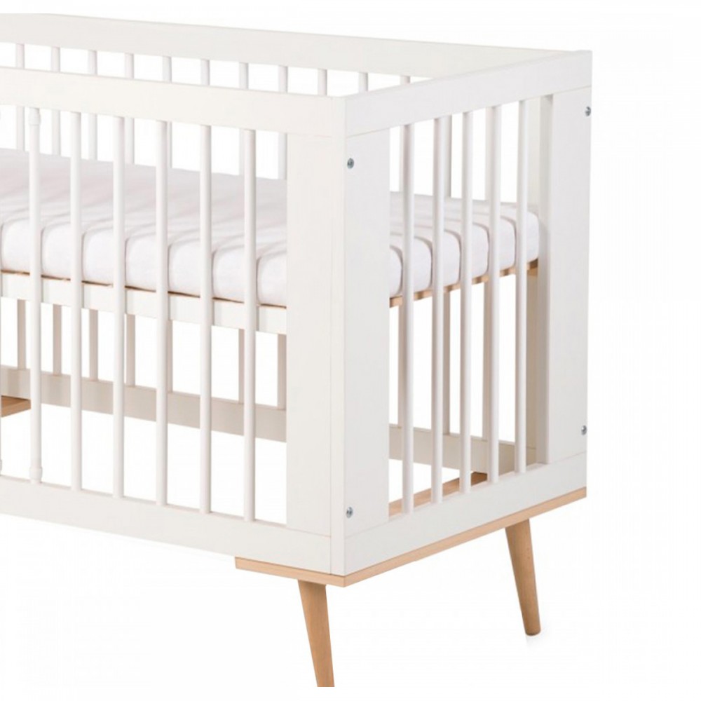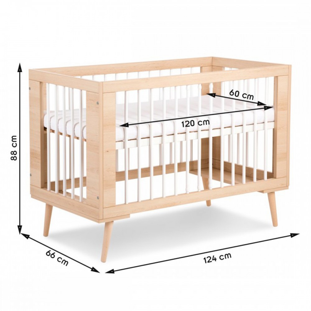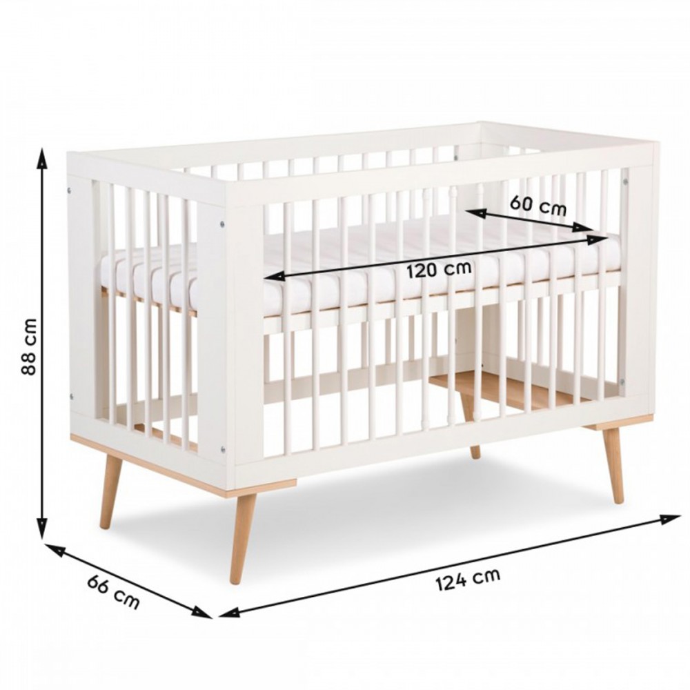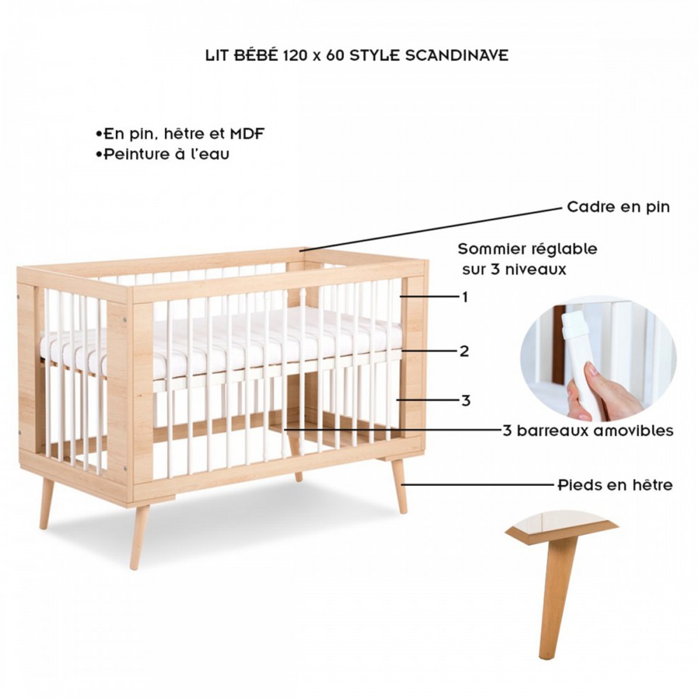 | bulletpointB | Lit 120x60 cm avec sommier à lattes réglable et barreaux amovibles. 2 modèles : blanc ou hêtre. |