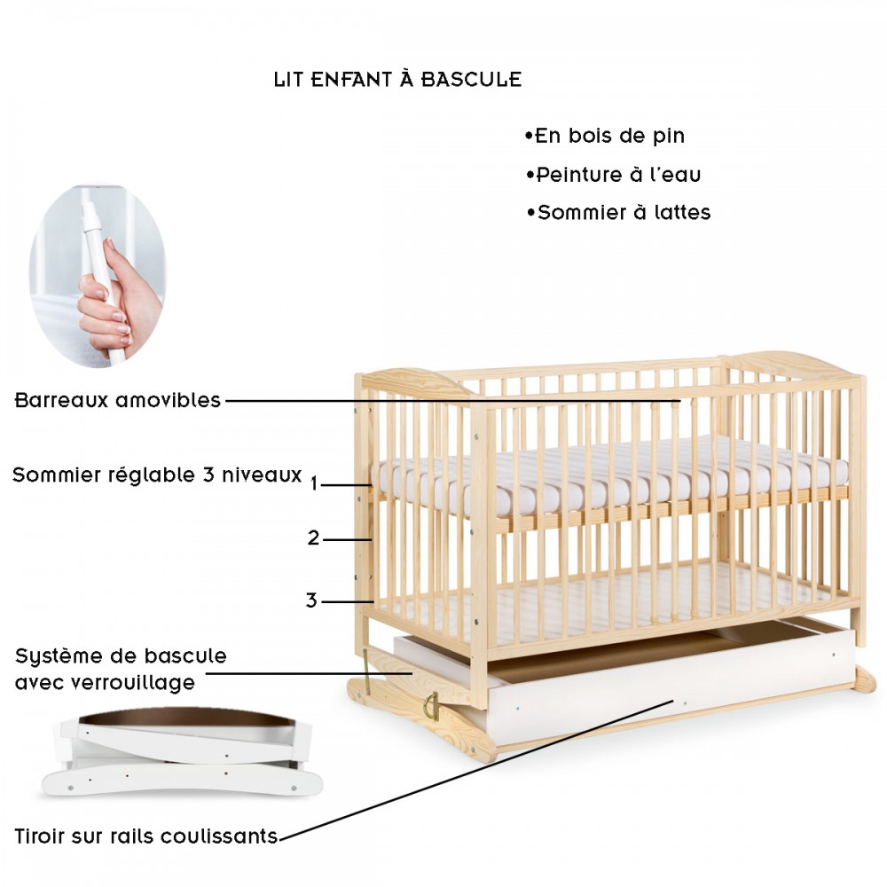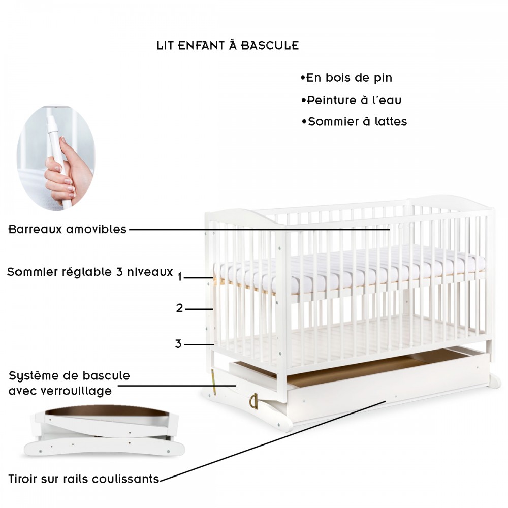 | bulletpointA | Ce lit pour enfant dispose d'un système de balancier manuel qui permet de bercer le bébé. Possibilité de le verrouiller. |