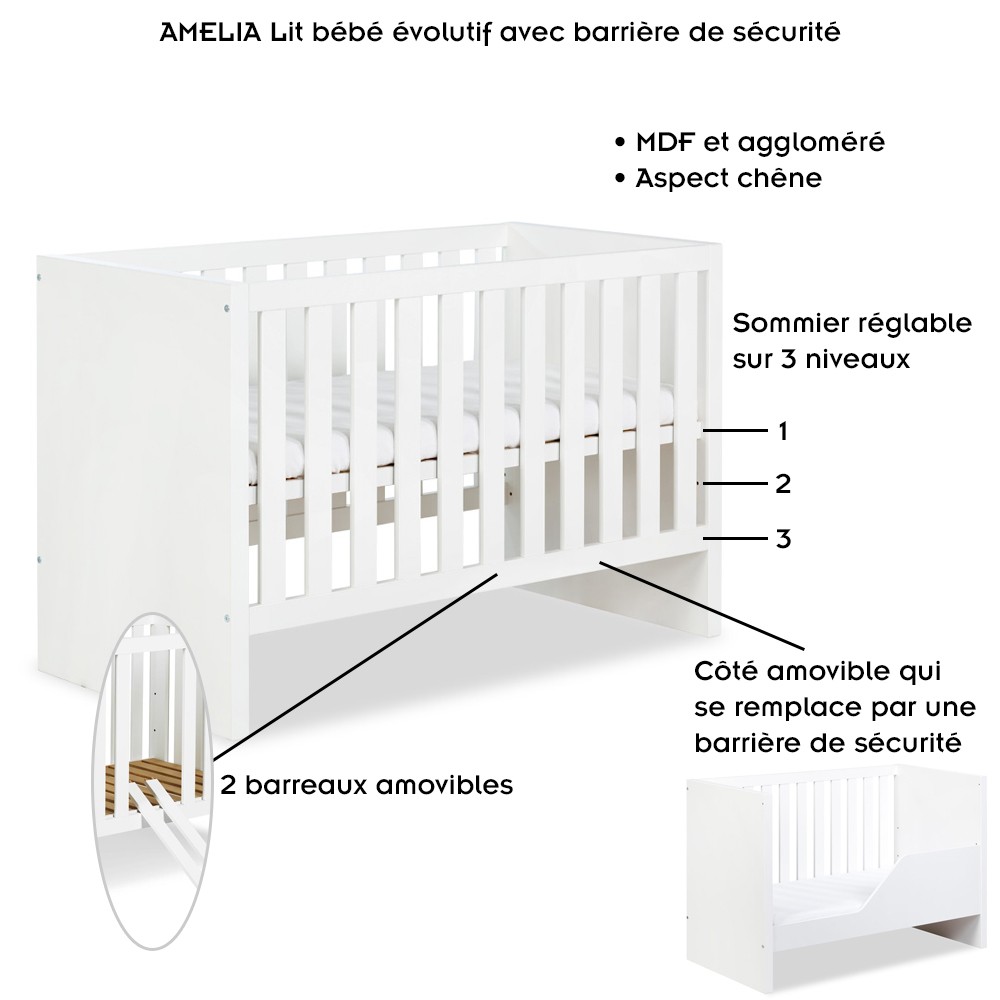 Ce lit est évolutif et suit la croissance de votre enfant. Son sommier à lattes se règle sur 3 hauteurs différentes afin de s’adapter à l’âge de l’enfant. 2 barreaux sont amovibles afin de faciliter l'entrée et la sortie de l'enfant. De plus, un côté est entièrement amovible et est remplaçable par une barrière de sécurité.