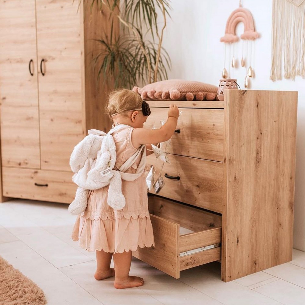 Elle possède 3 tiroirs sur rails coulissants. Lorsque l’enfant grandit, le plan à langer s’enlève pour laisser place à une commode ordinaire.