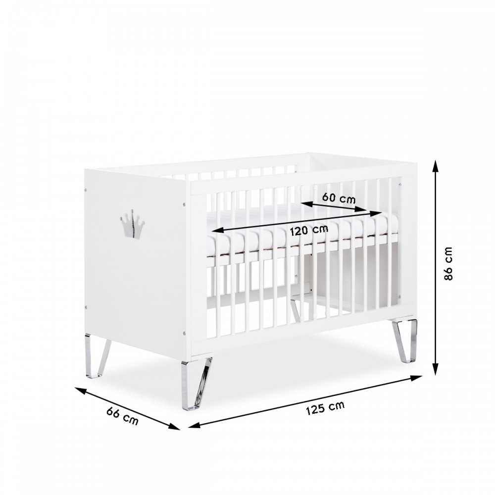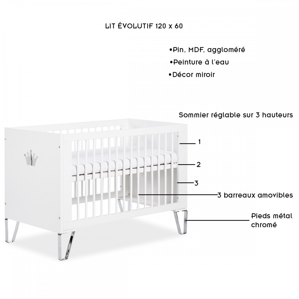 | bulletpointA | Lit à barreaux évolutif 120x60 pour bébé avec sommier réglable sur 3 hauteurs différentes. |