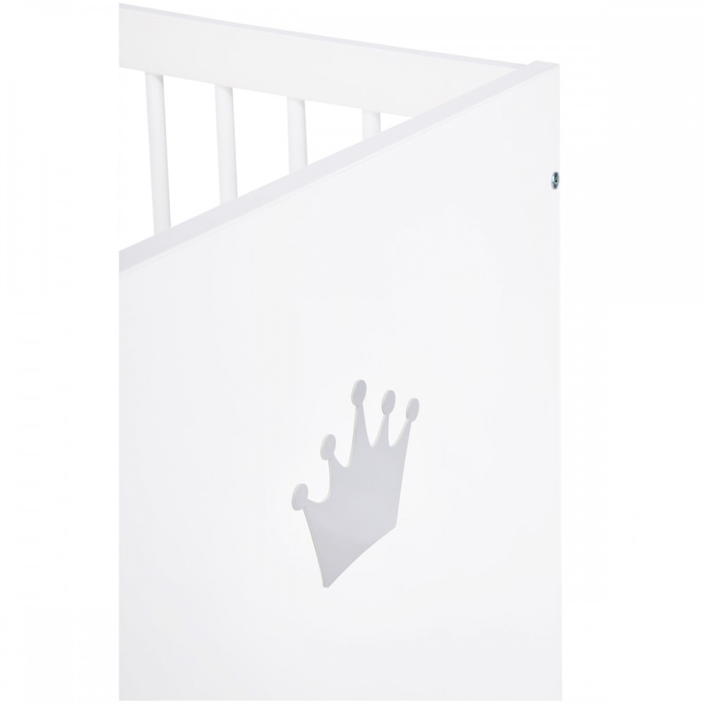 Composé de 2 côtés à barreaux et de deux panneaux pleins, ce lit évolutif séduit par ses pieds en métal chromé et son petit miroir en forme de couronne.