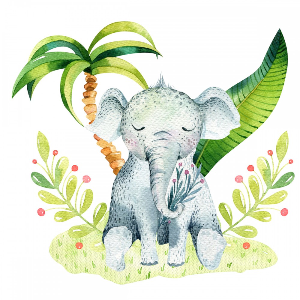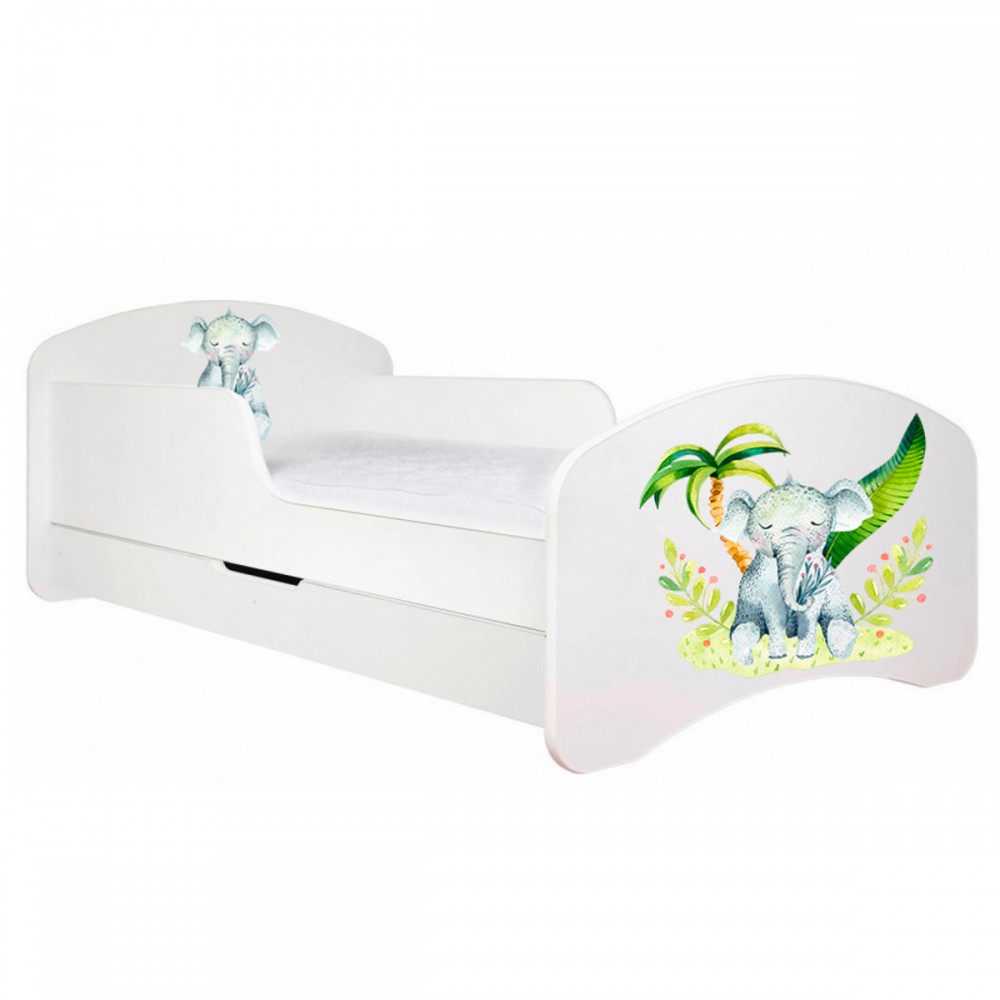 La tête et le pied de lit sont décorés d’un motif éléphant aux couleurs pastel.
