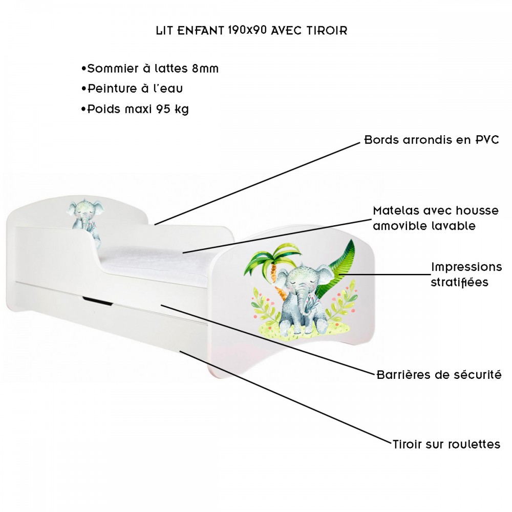 | bulletpointA | Lit enfant 1 personne avec matelas. Le lit est décoré avec un motif pastel. Le lit est vendu avec ou sans tiroir. |