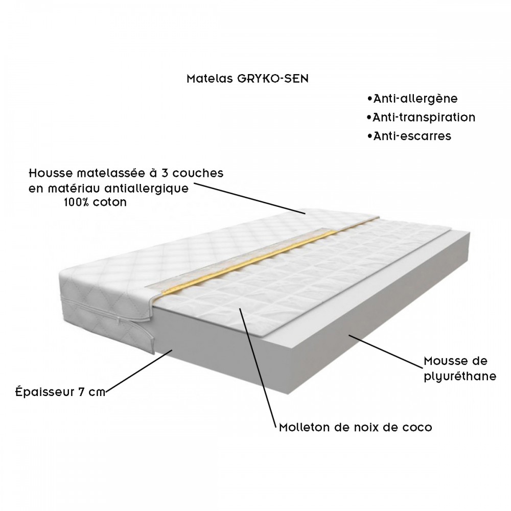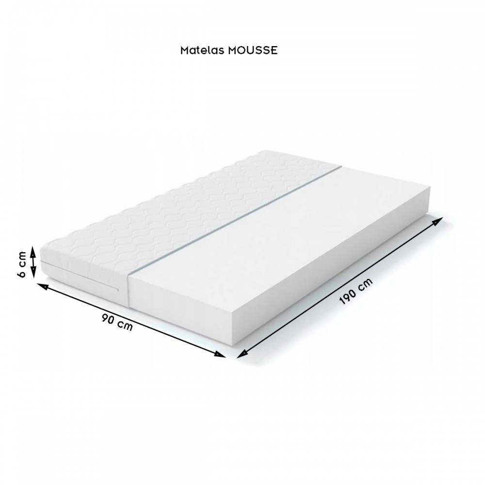 Ce lit est vendu avec un matelas, disponible dans plusieurs textures, dont la housse amovible est lavable.