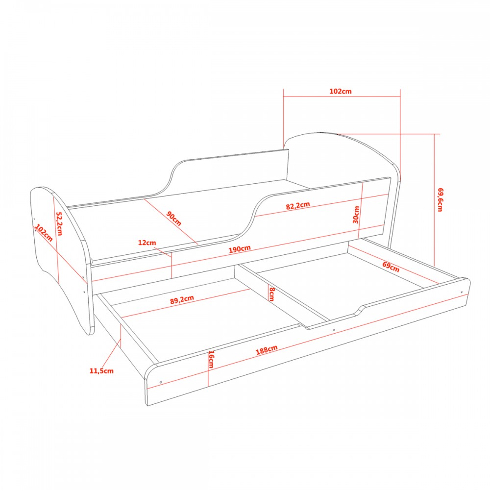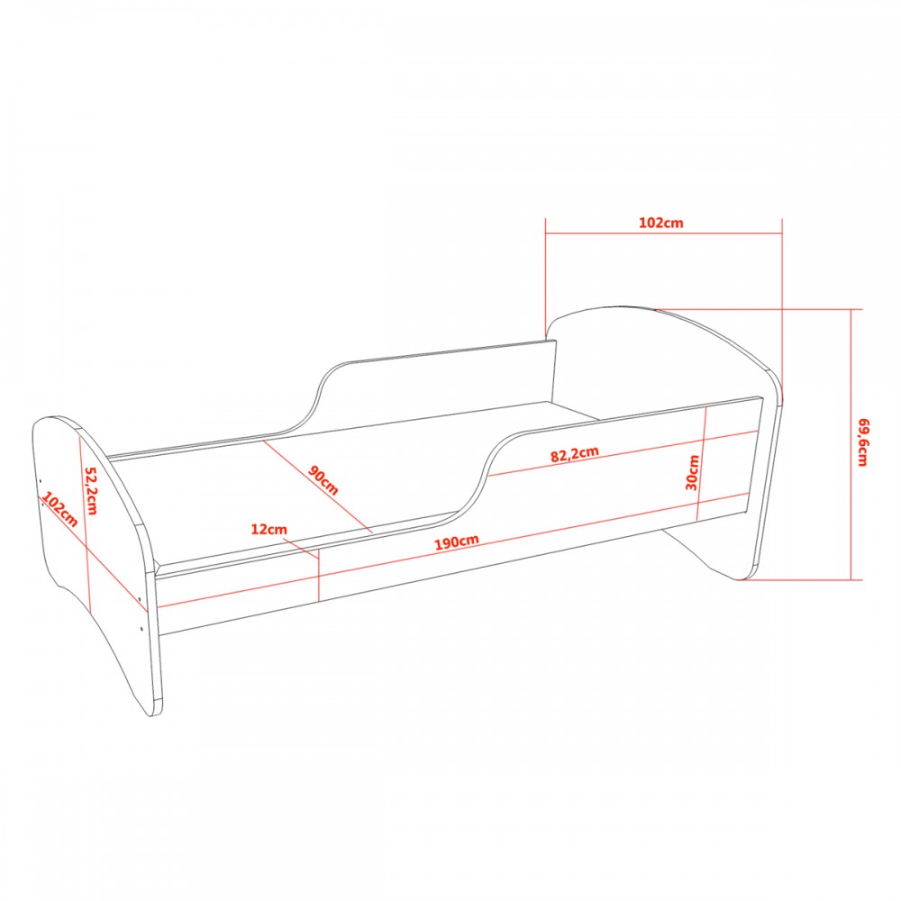 Dimensions extérieures du lit : L 195 cm x l 102 cm x H 69,6 cm.