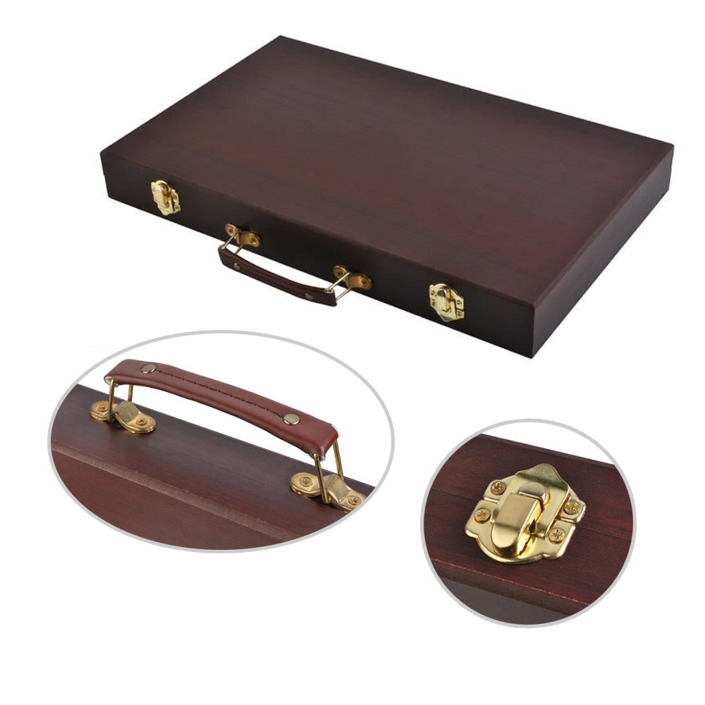| bulletpointC | Les accessoires sont placés dans une mallette en bois munie d'une poignée en simili durable et confortable pour la transporter partout ou vous souhaitez exprimer votre art. |