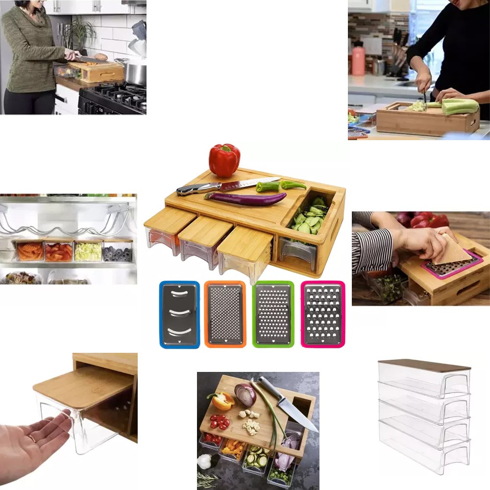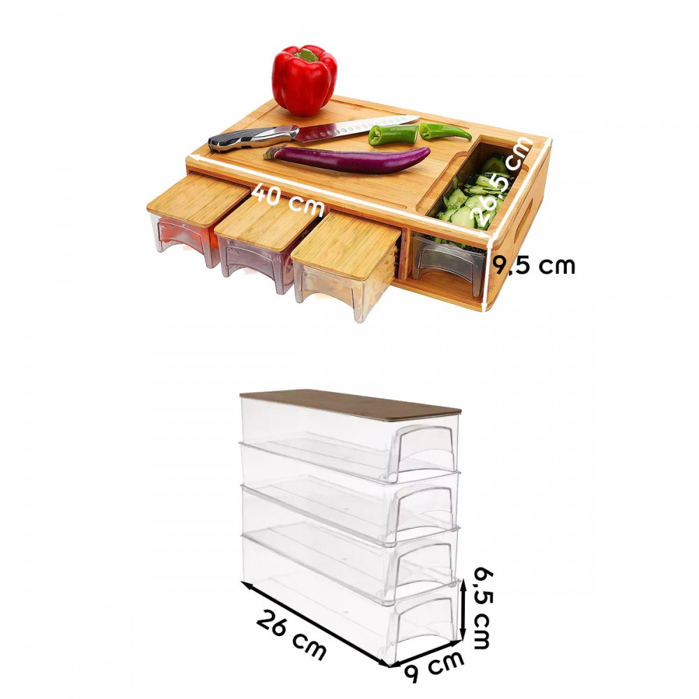 Cette planche à découper en bambou contient 4 récipients avec couvercles permettant de stocker, conserver et transporter les aliments. Ils peuvent être empilés les uns sur les autres.