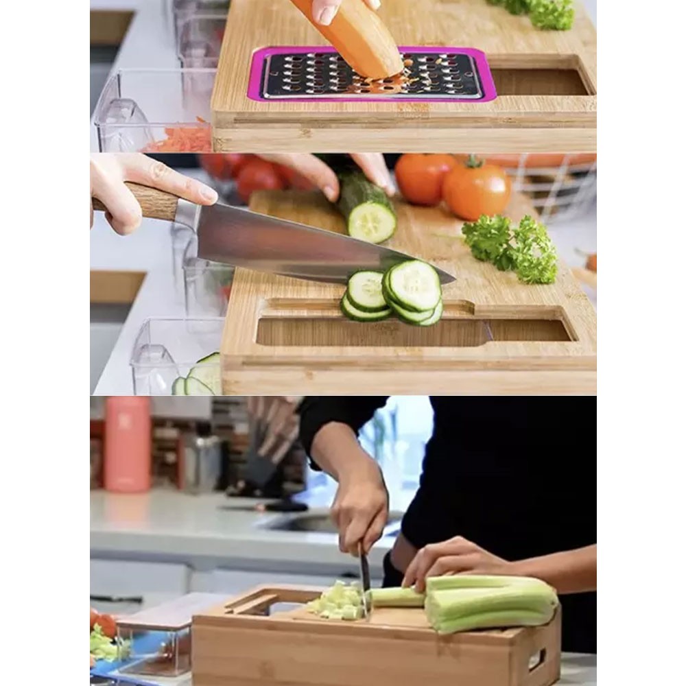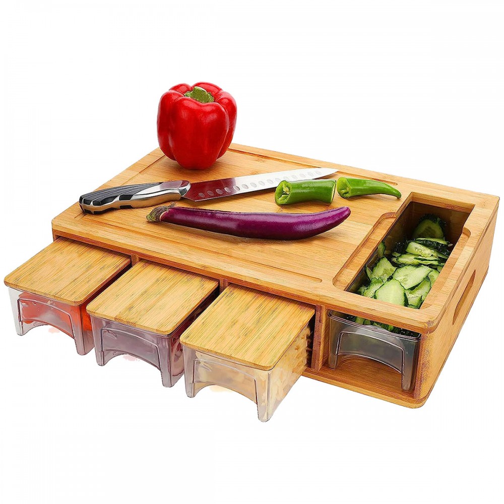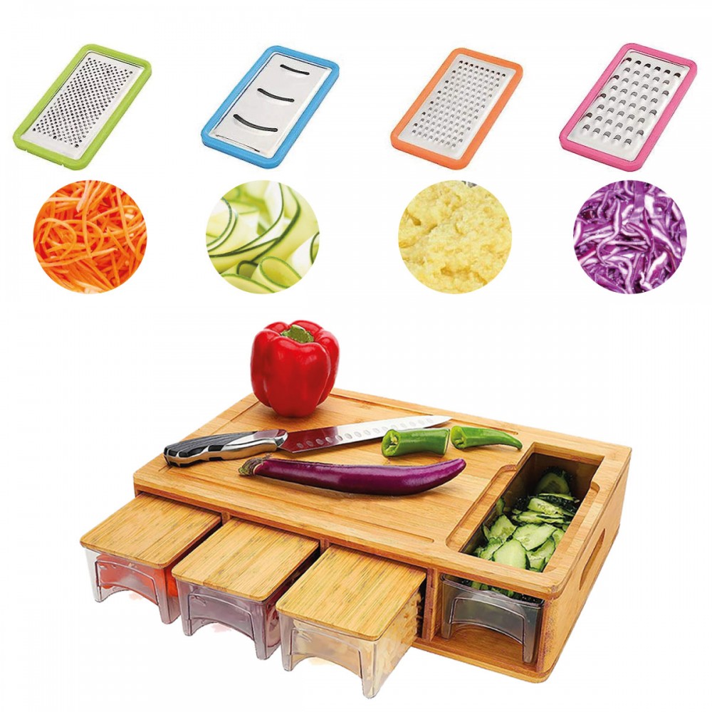 | bulletpointA | Cette planche à découper en bambou contient 4 récipients avec couvercles et 4 râpes incluses. |