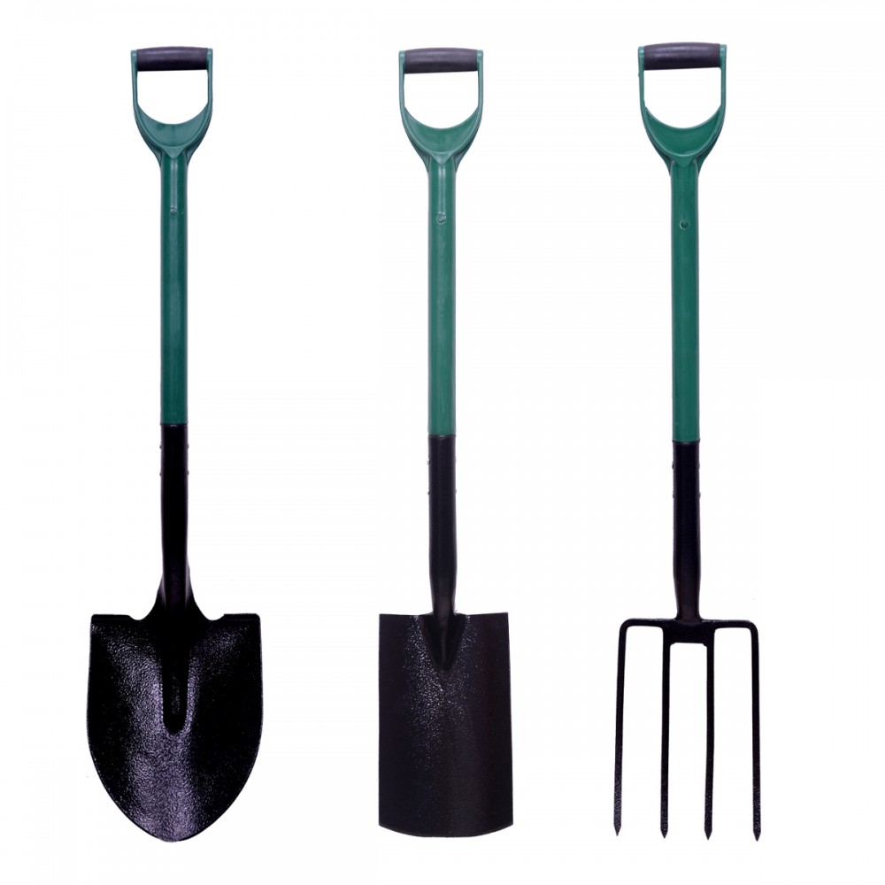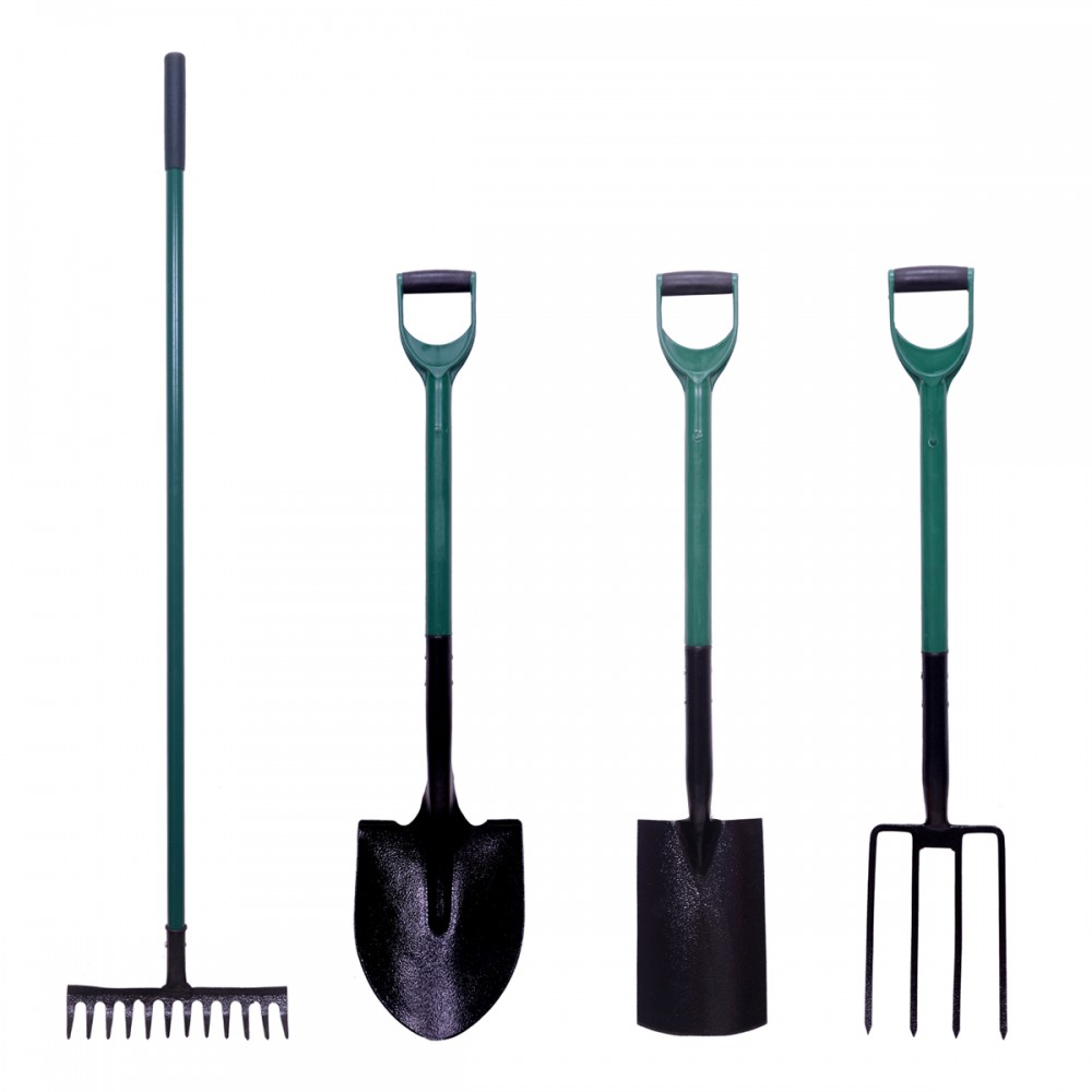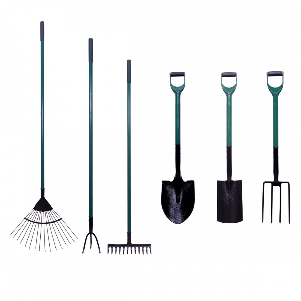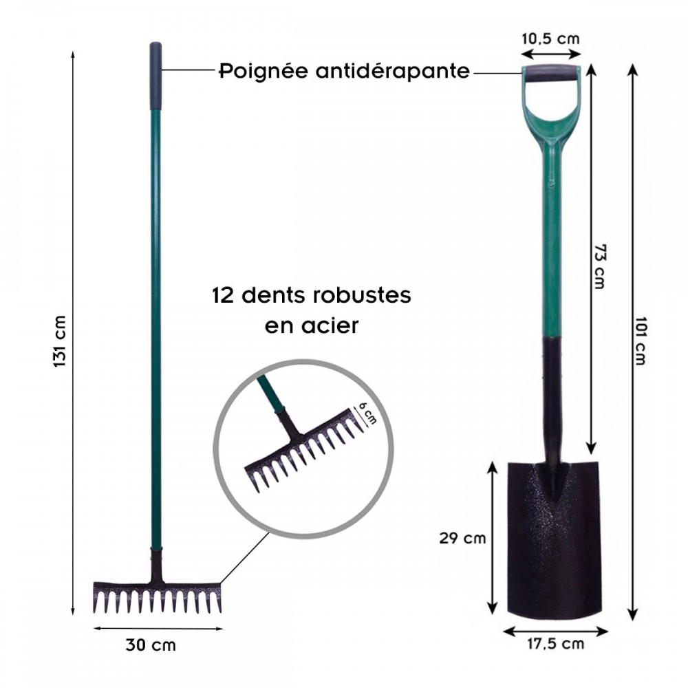 | bulletpointB | Pelle, fourche, bêche, râteau, râteau à feuilles et griffe 3 dents. |