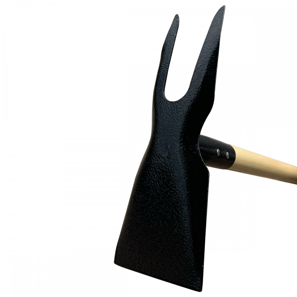 Avec un côté carré et l'autre muni de deux dents solides et maniables, cet outil est celui des travaux de force au jardin.
