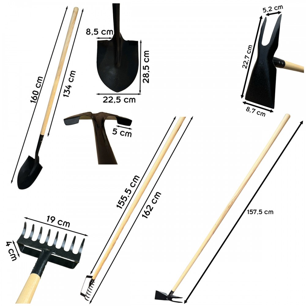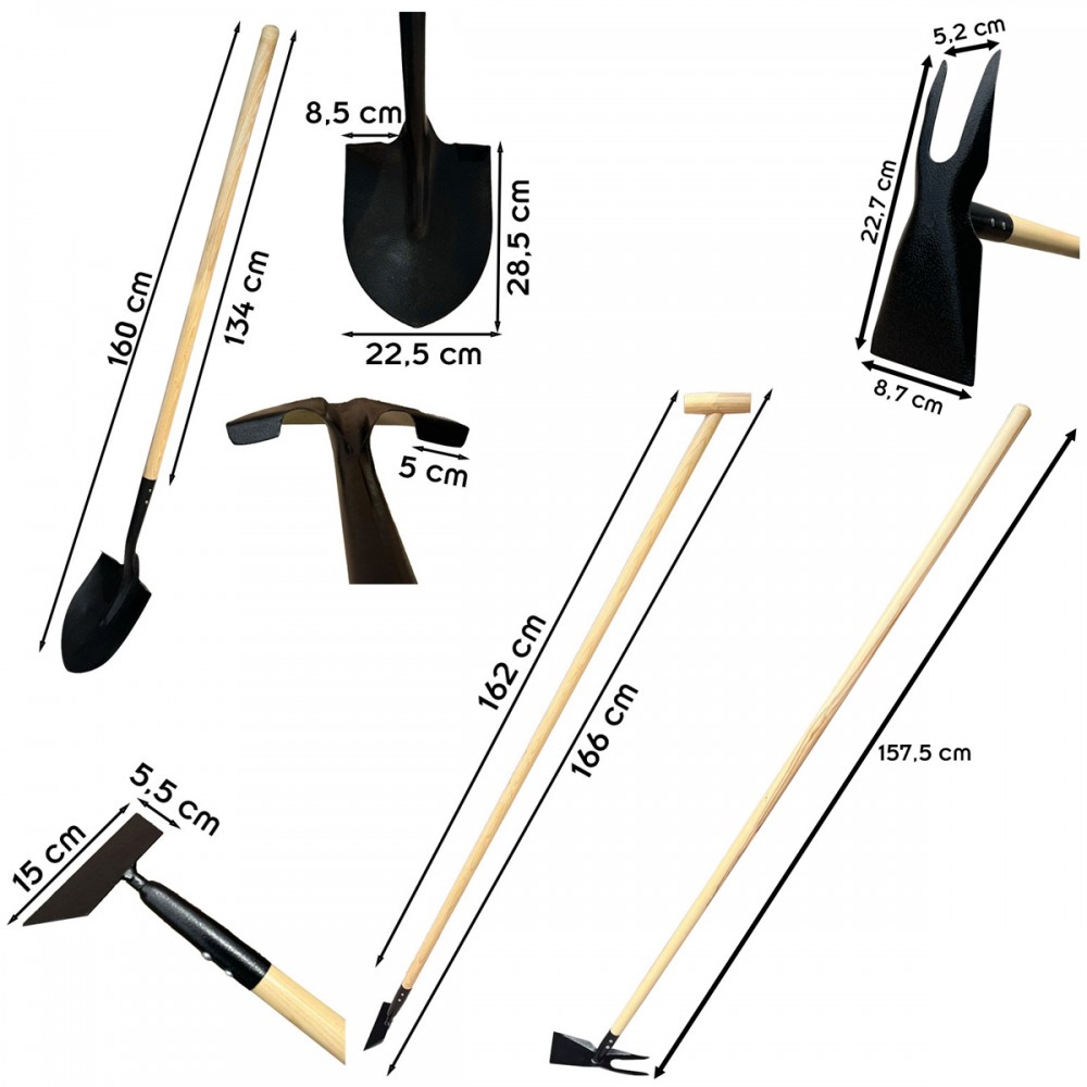 | bulletpointA | Lots d'outils de jardinage avec pelle + râteau ou binette et serfouette panne et fourche ou panne et langue. |