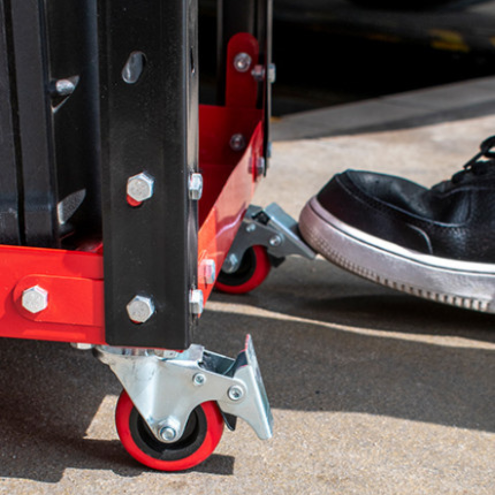 | bulletpointC | Une poignée, 2 roues fixes et 2 roues pivotantes ∅ 50 avec frein aide à manœuvrer. |