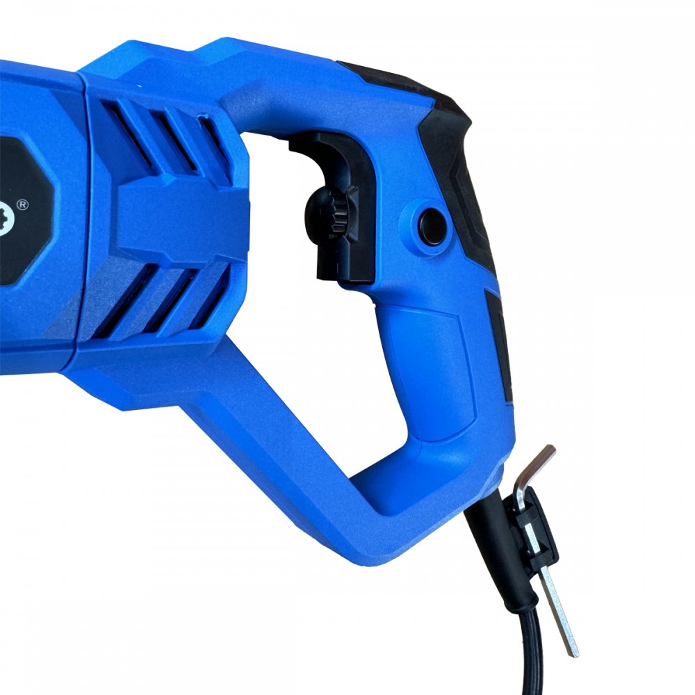 Un bouton de verrouillage maintient la scie allumée sans maintenir la gâchette. Cette scie a une cadence de coupe allant jusqu'à 2800 cps/min. Un variateur de vitesse se trouve sur la gâchette.
