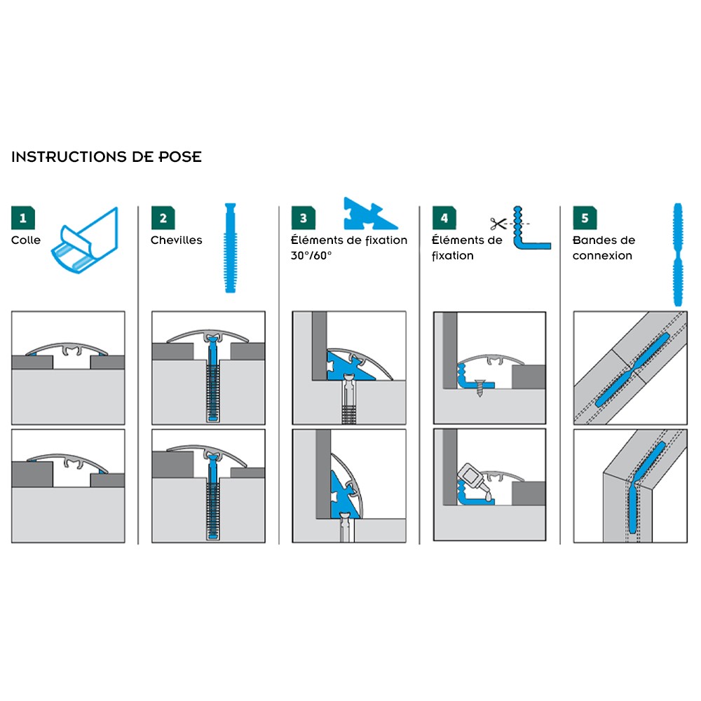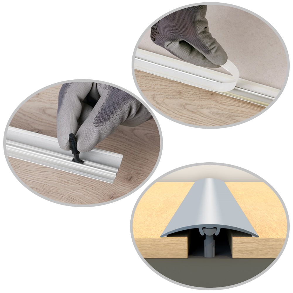 Pour les barres de seuil largeur 37 mm : La barre peut-être collée ou fixée (bandes adhésives, chevilles, éléments de fixation et bandes de connexion inclus). Elle permet de compenser une différence de niveau allant jusqu'à 8 mm.