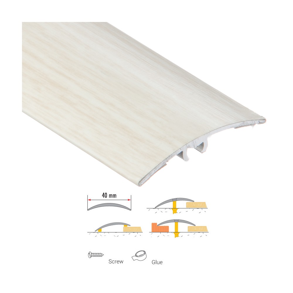 Pour les barres de seuil largeur 40 mm (hors champagne) : La barre est à fixer avec des chevilles invisibles (incluses). Elle permet de compenser une différence de niveau allant jusqu'à 14 mm.