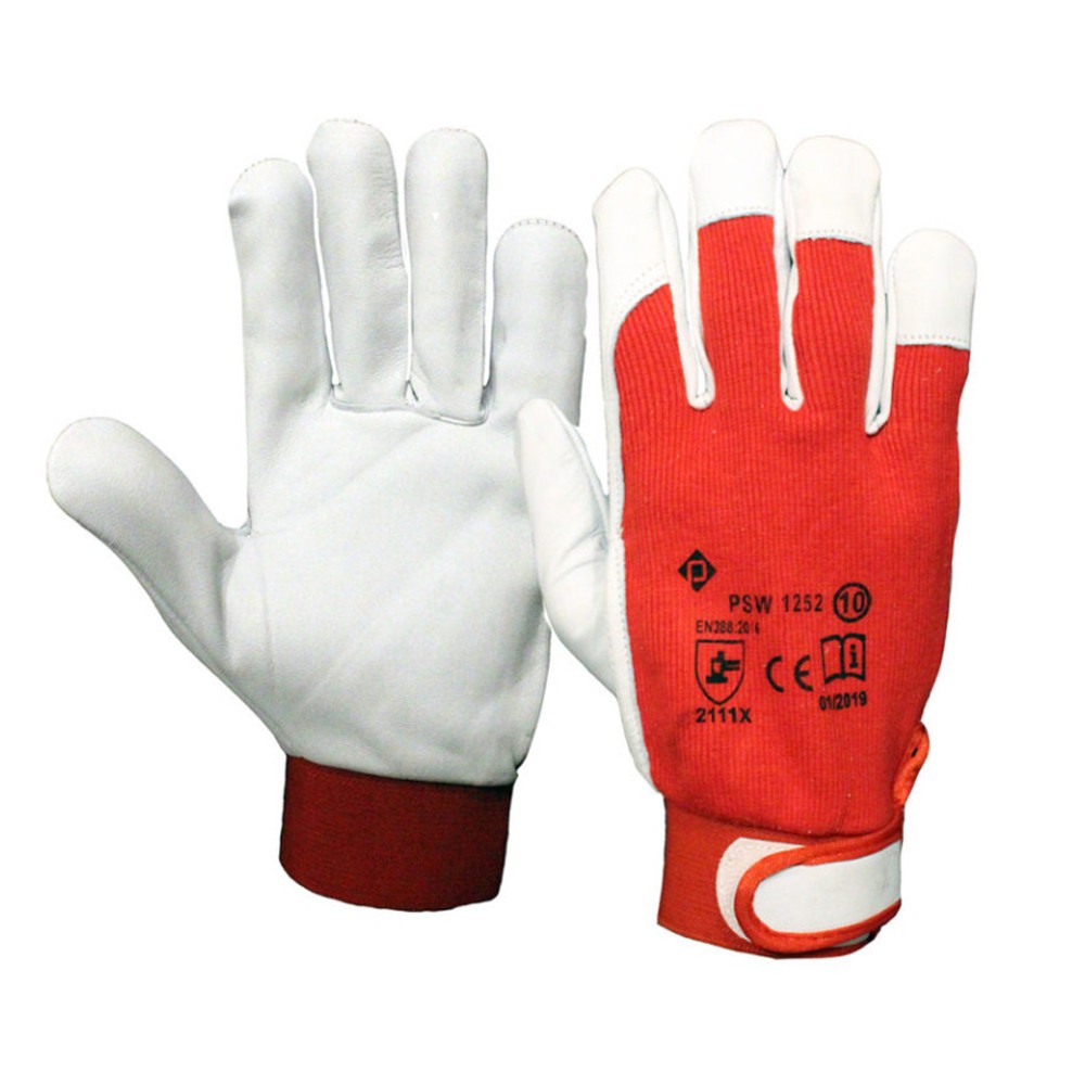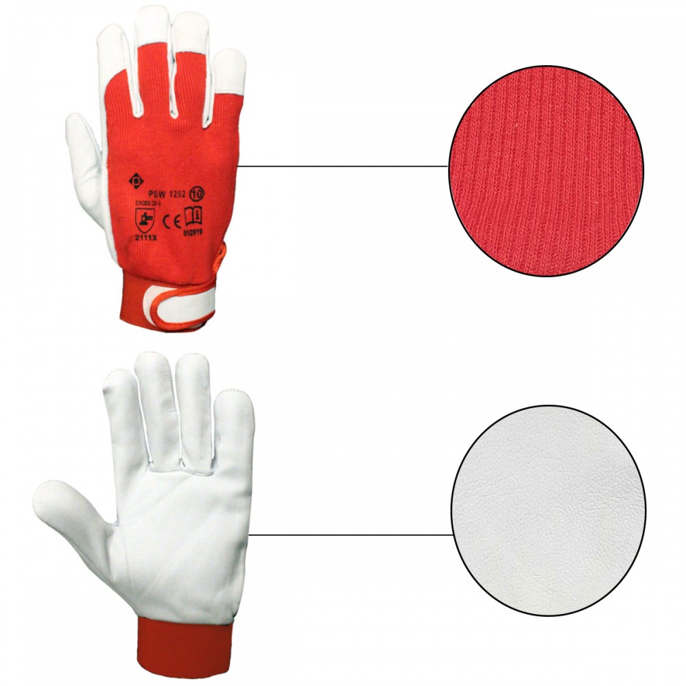 | bulletpointA | Gants de manutention en cuir coupe américaine bleu clair et rouge tour de paume de 24 à 26cm. |