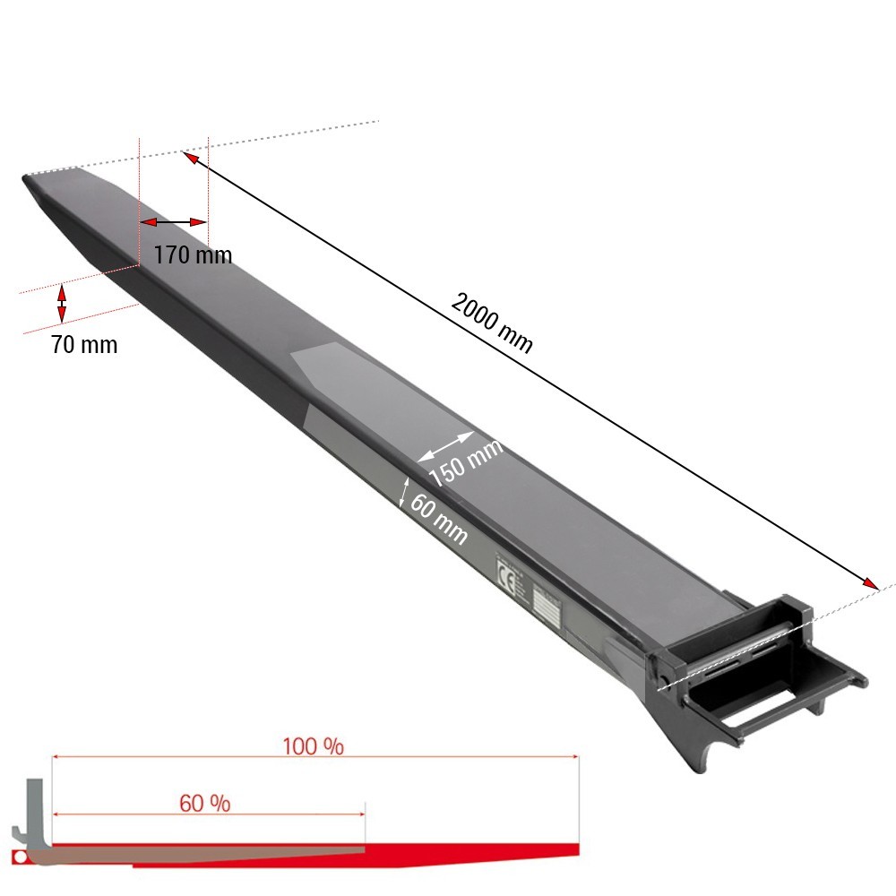 Rallonges de 2000 mm pour fourches de 150 x 60 mm : 7 tonnes.