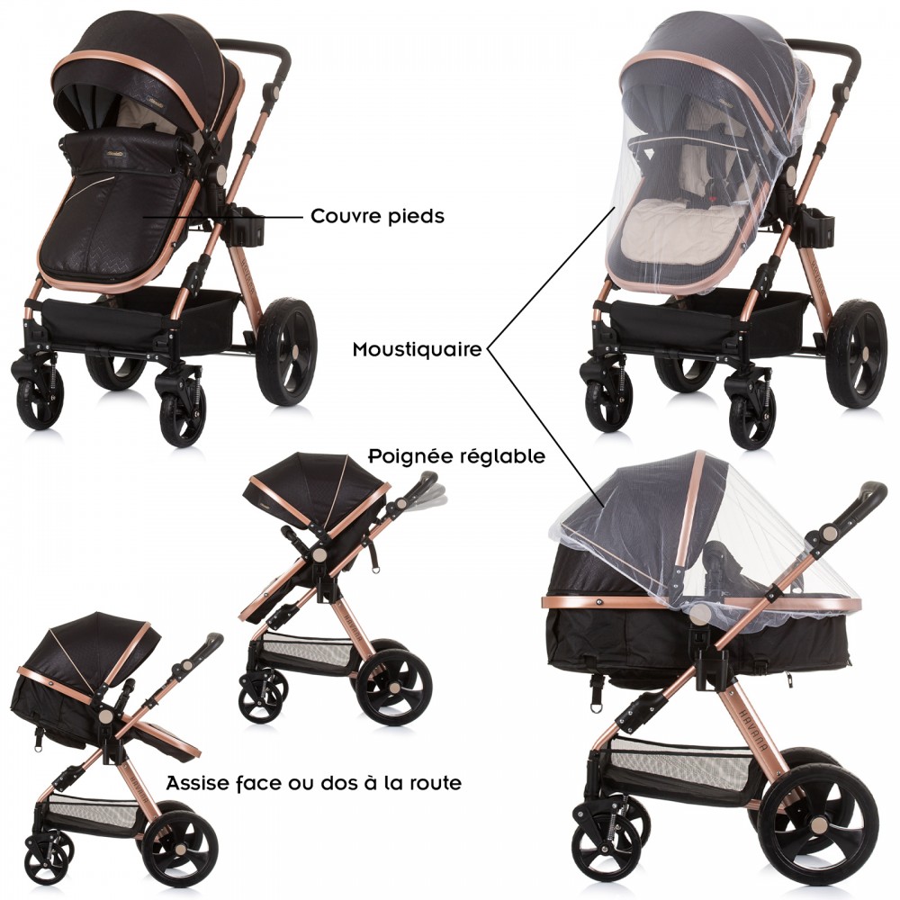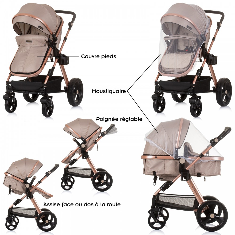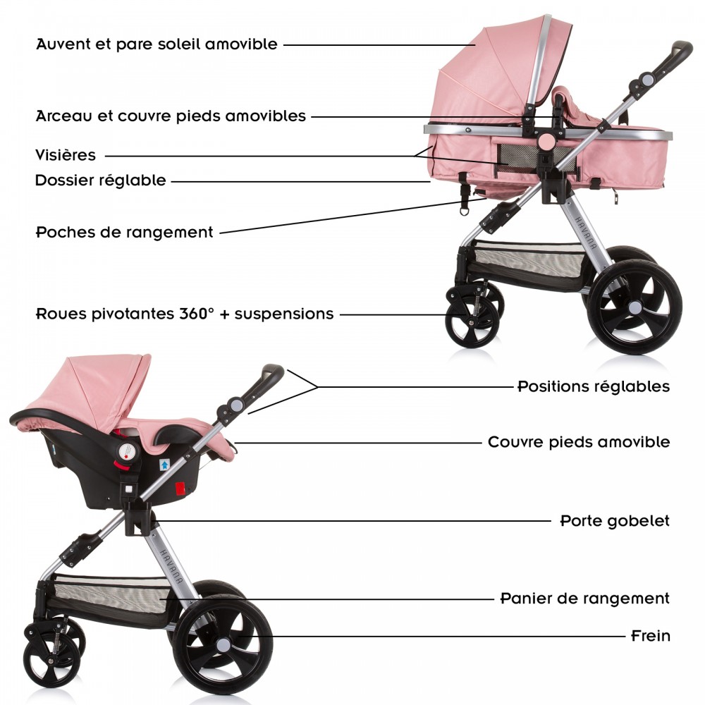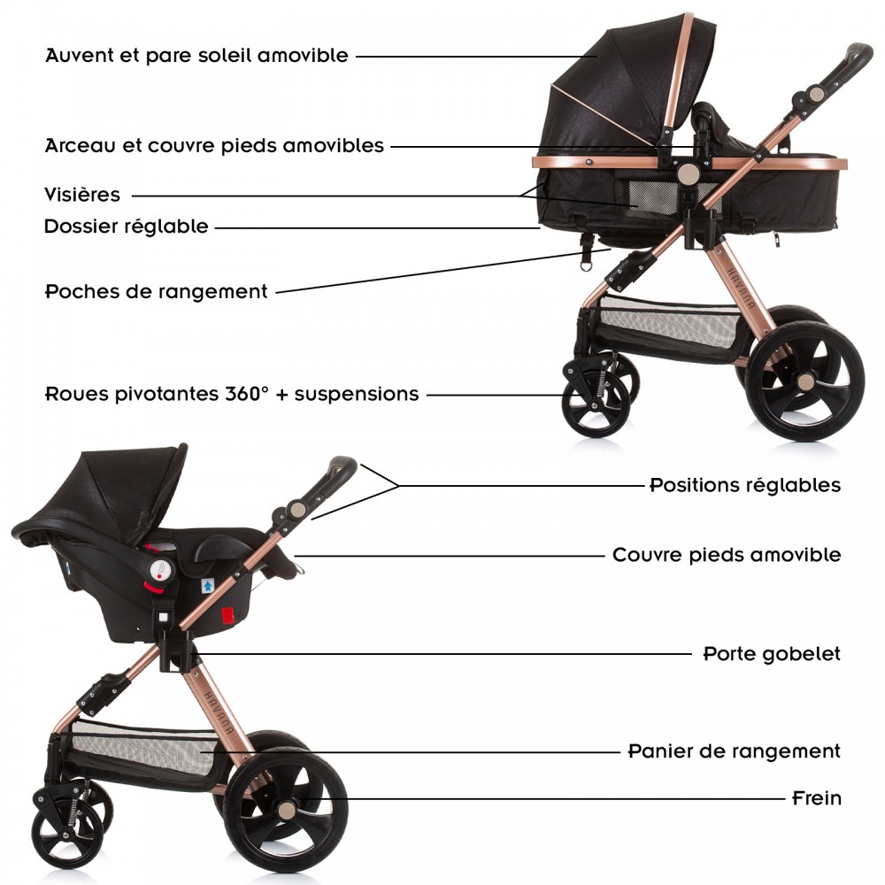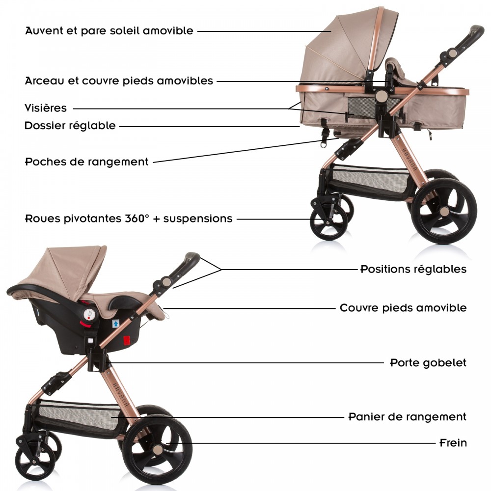 | bulletpointD | Nacelle transformable. Dossier réglable. Filet de circulation d'air. Capote rétractable. Arceau et chancelière amovibles. |