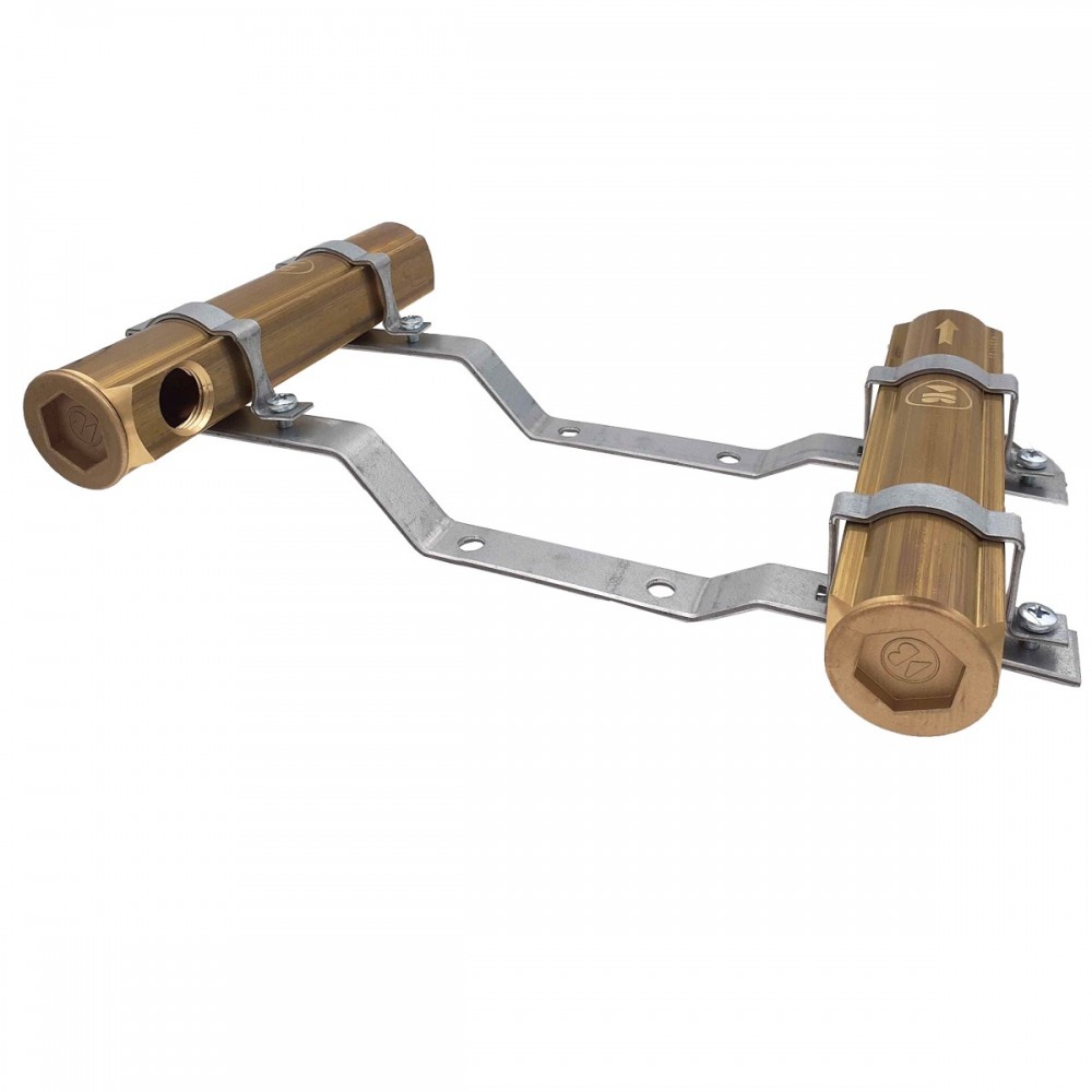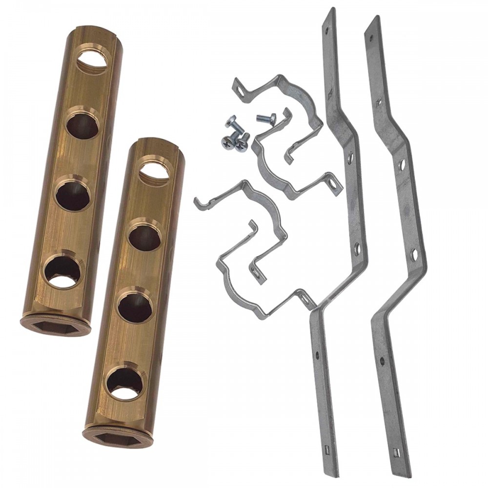 Ensemble composé de 2 collecteurs barreau 4 sorties femelle pour tube PER Ø16X1/2" en laiton avec trou de purge + les fixations.