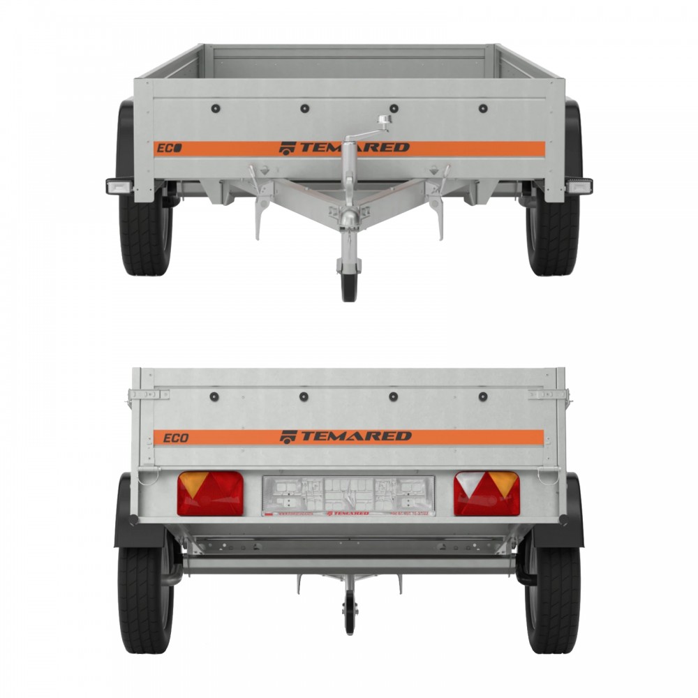 | bulletpointB | Grande remorque avec ridelle arrière amovible et basculante. L'essieu peut supporter jusqu'à 750 kg. |