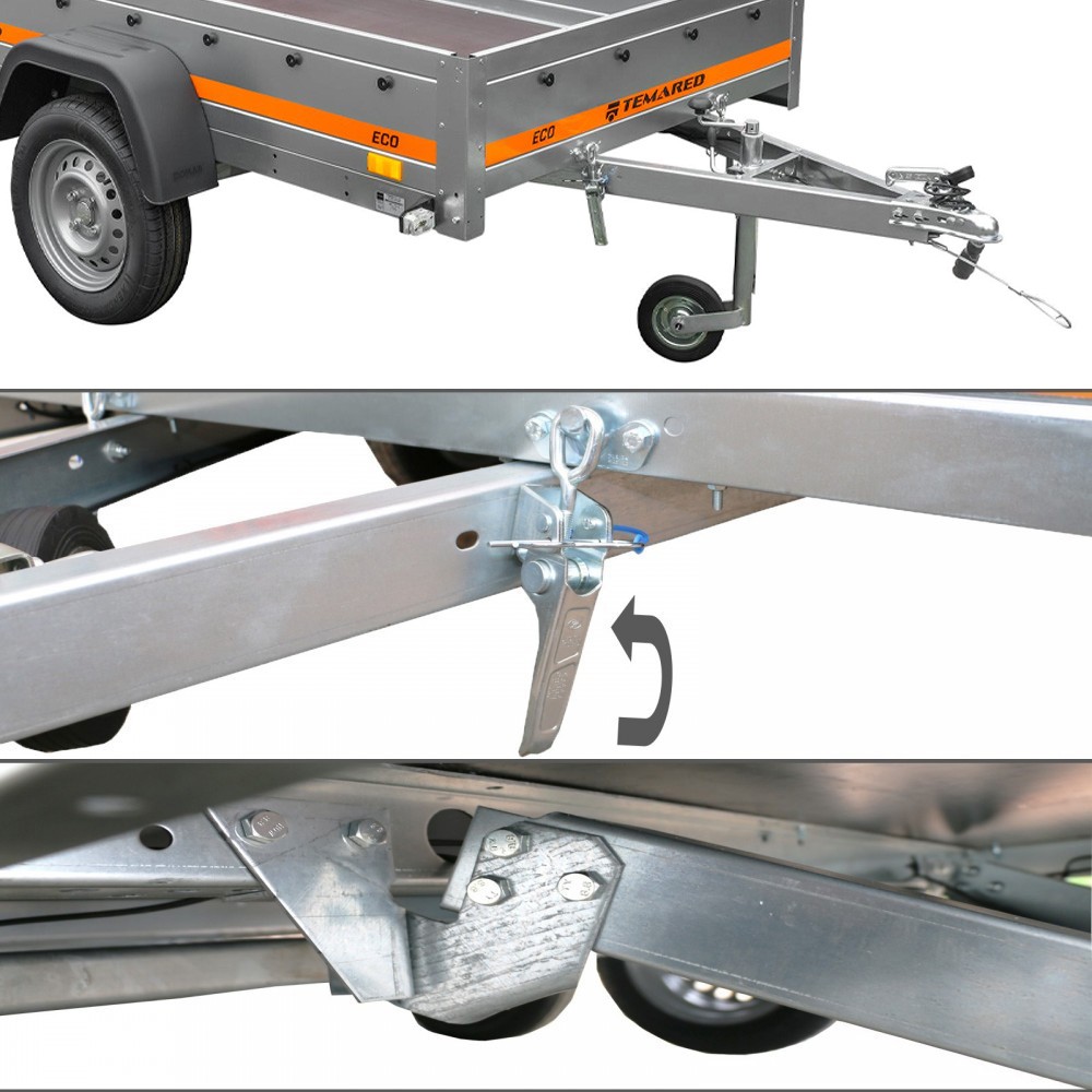Ridelles en acier galvanisé de 30 cm de haut + support de bâche 80 cm : total 110 cm du plancher à la bâche. Remorque avec bâche et armature incluses. Essieu force 750 kg. PTC 500 kg. (pas de carte grise, ni de permis, ni d'assurance supplémentaire nécessaire). Ridelle arrière ouvrante, rabattable et amovible. Caisse basculante pour un déchargement facile pour le sable, remblais, bois...