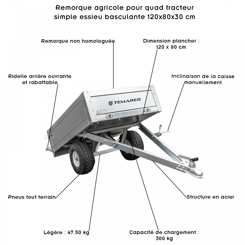 | bulletpointA | Remorque simple essieu à atteler à un tracteur un quad une tondeuse. Idéal pour travailler dans le jardin ou à la ferme. |