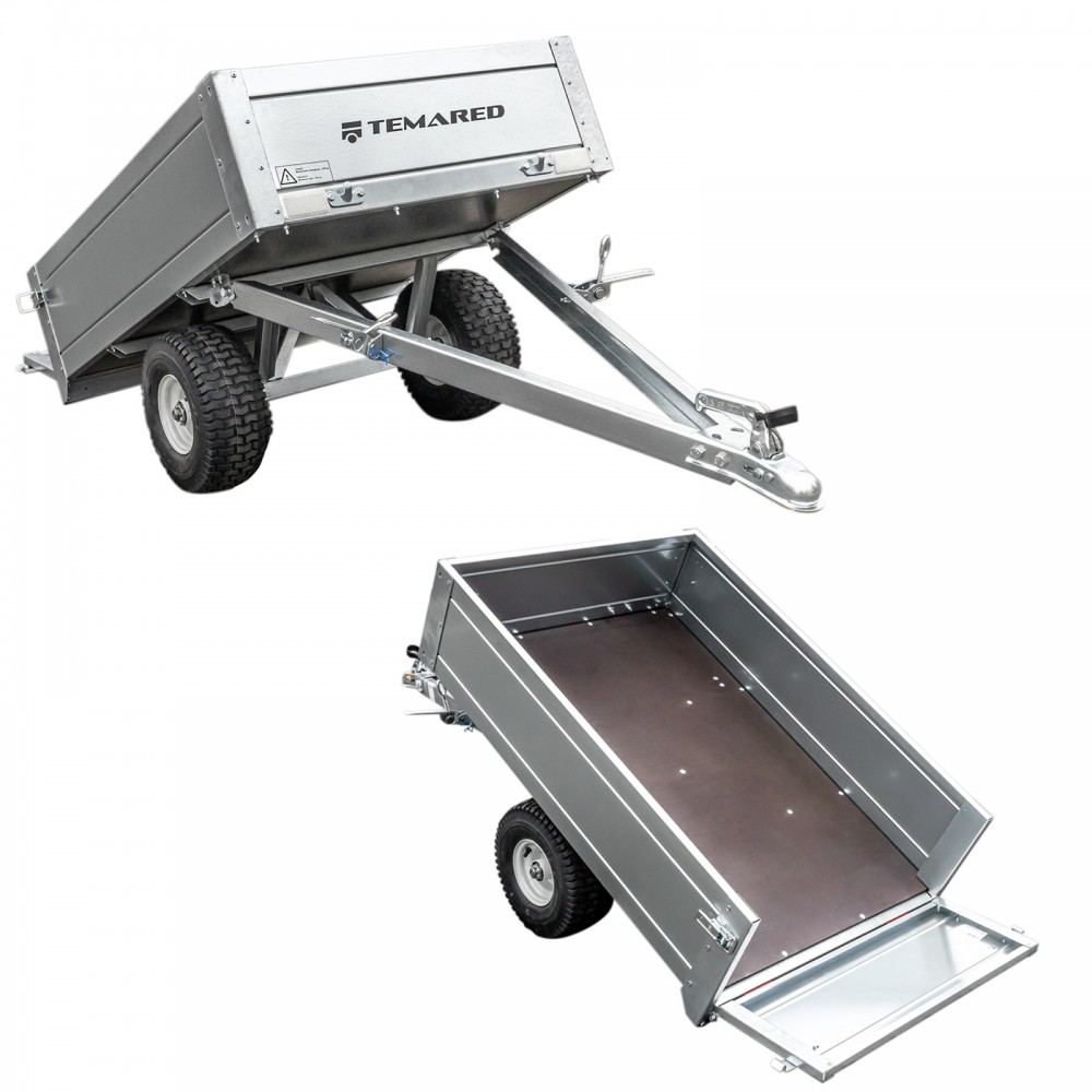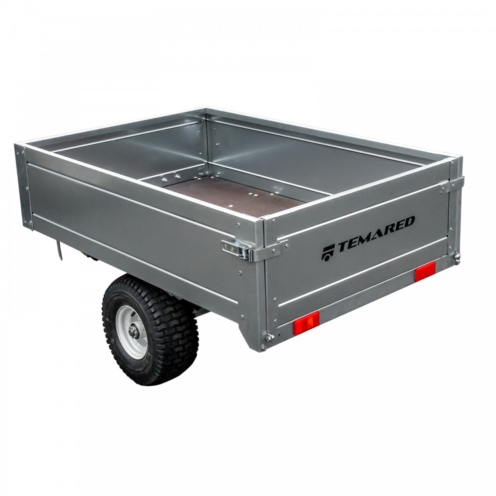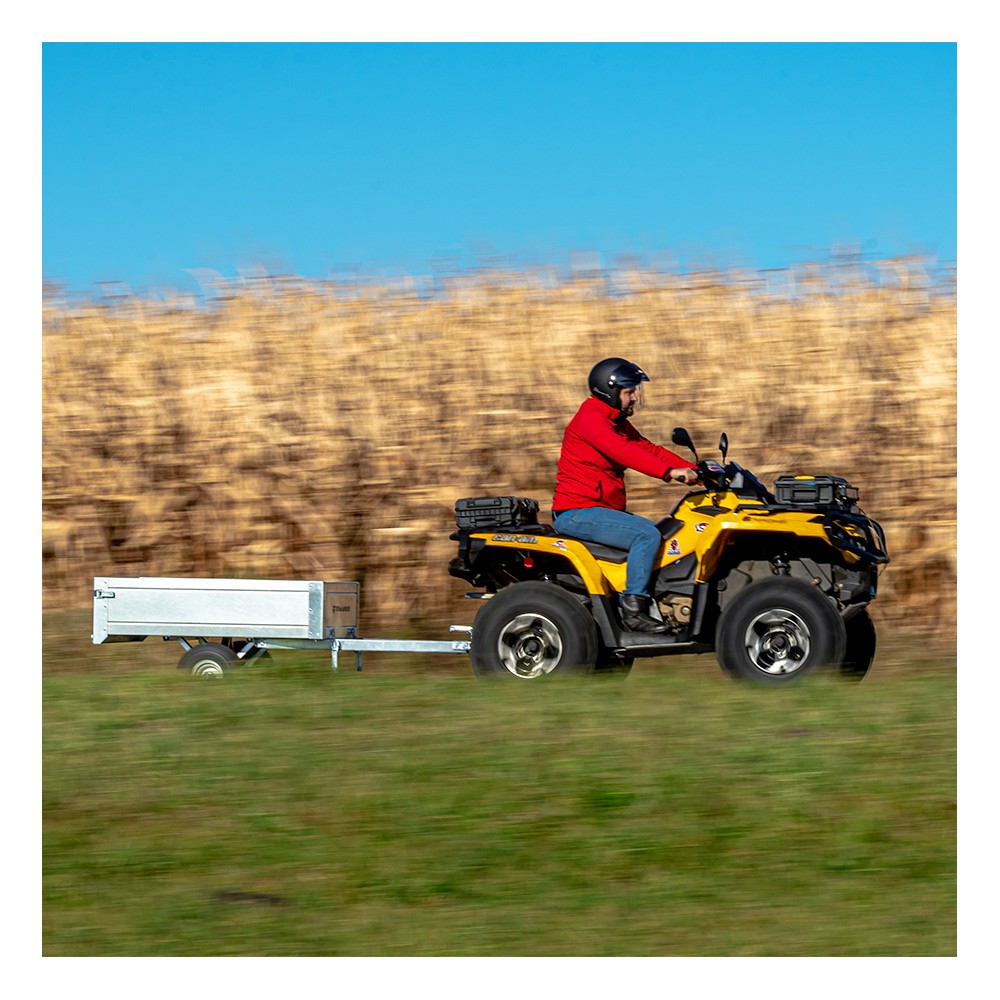Remorque en acier robuste et durable à atteler derrière un quad, un tracteur ou une tondeuse.