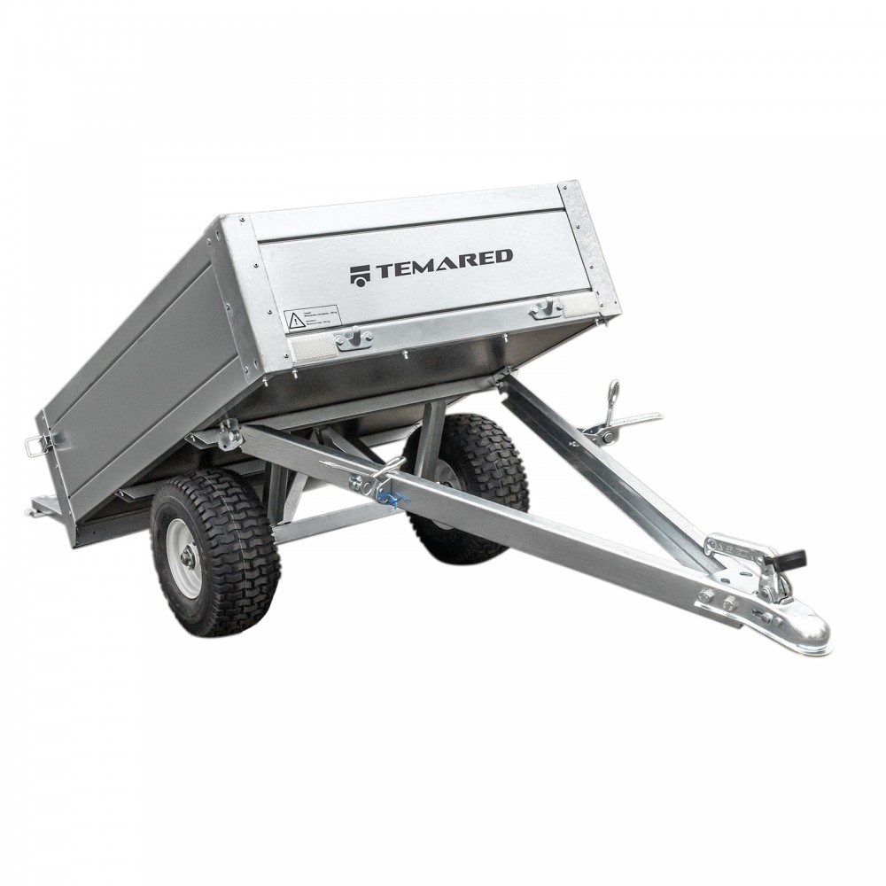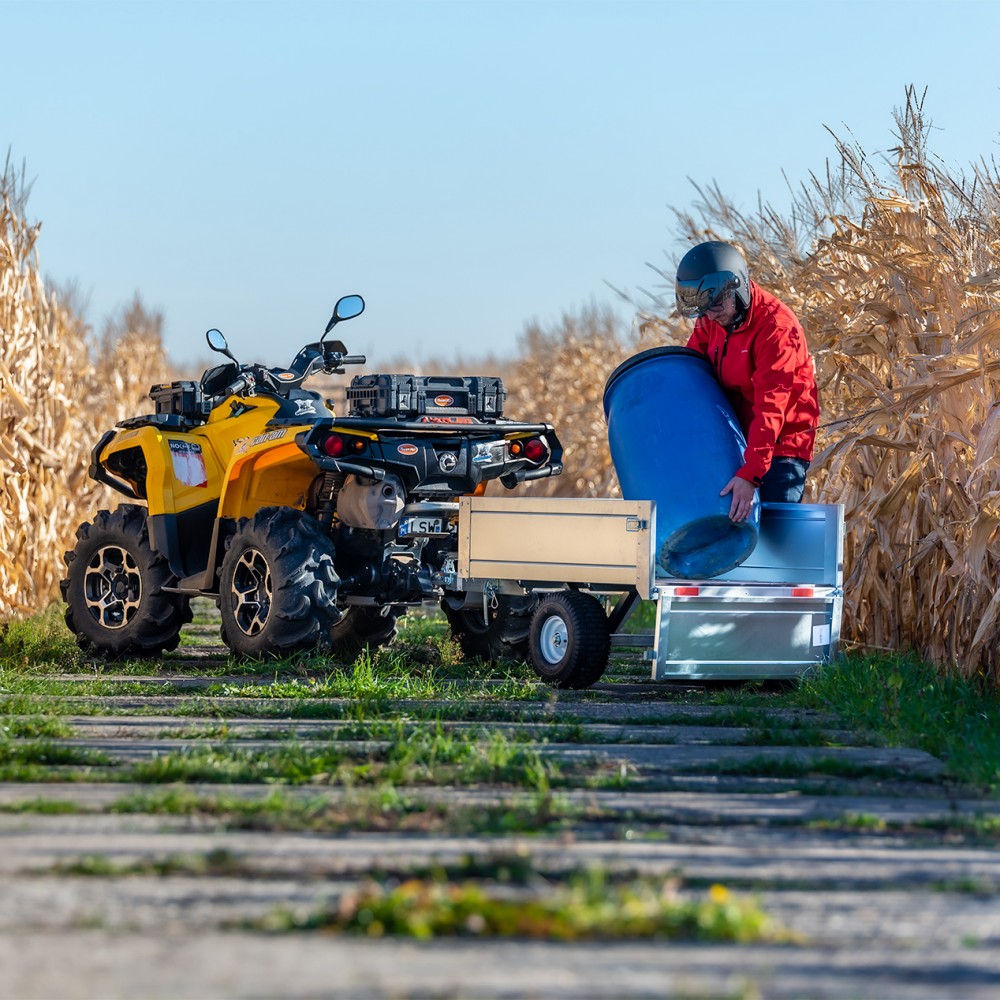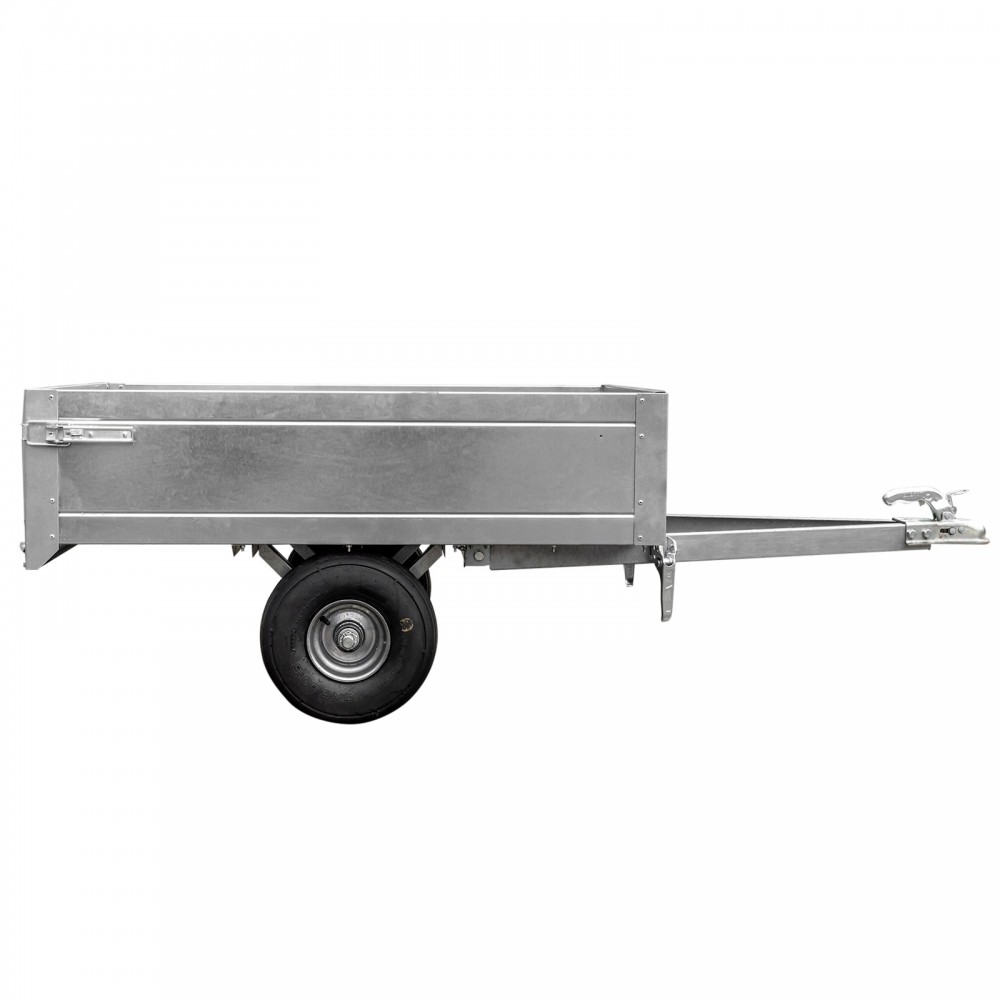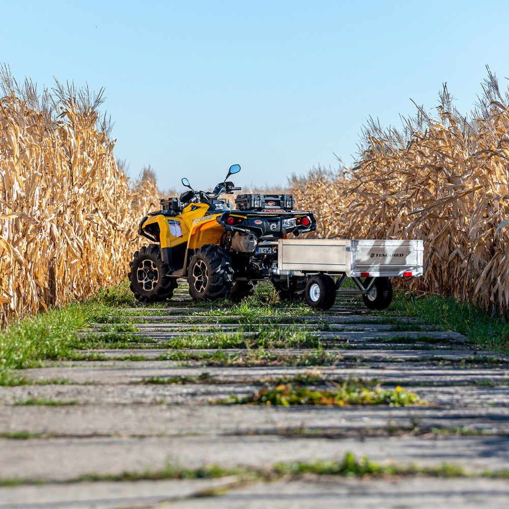 Remorque en acier robuste et durable à atteler derrière un quad, un tracteur ou une tondeuse.