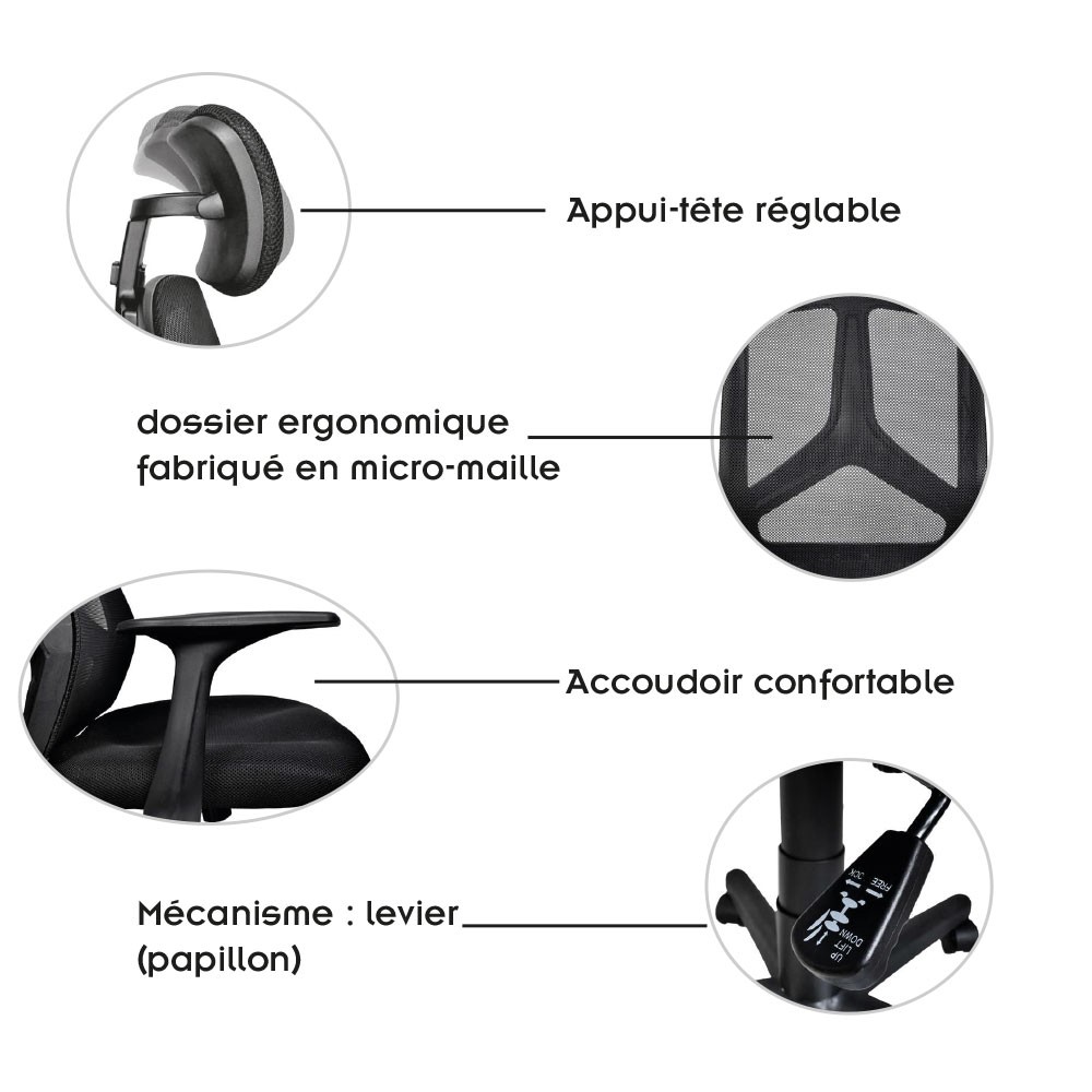 | bulletpointA | Fauteuil de bureau pivotant, ergonomique, confortable et réglable en hauteur avec appui-tête. |