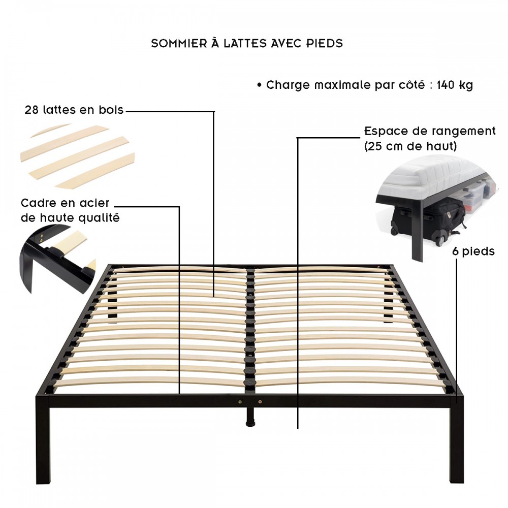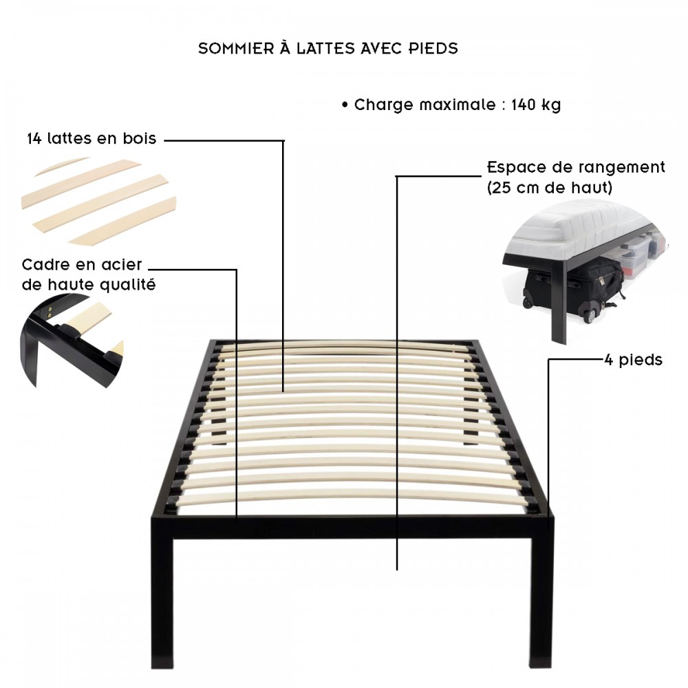 | bulletpointA | Sommier de lit à lattes en bois avec pieds. Cadre métallique résistant de grande qualité. |