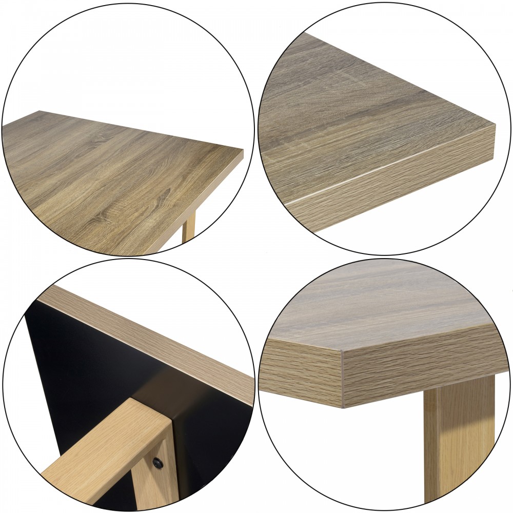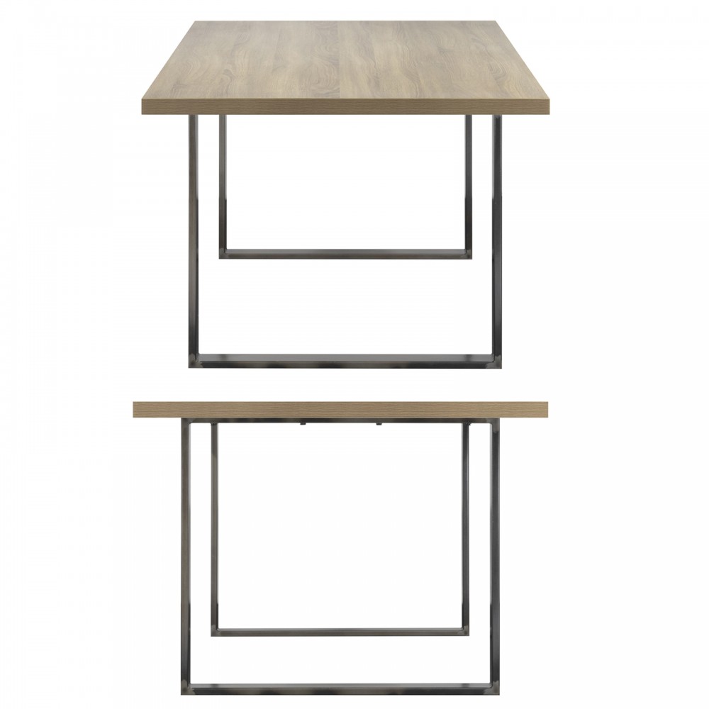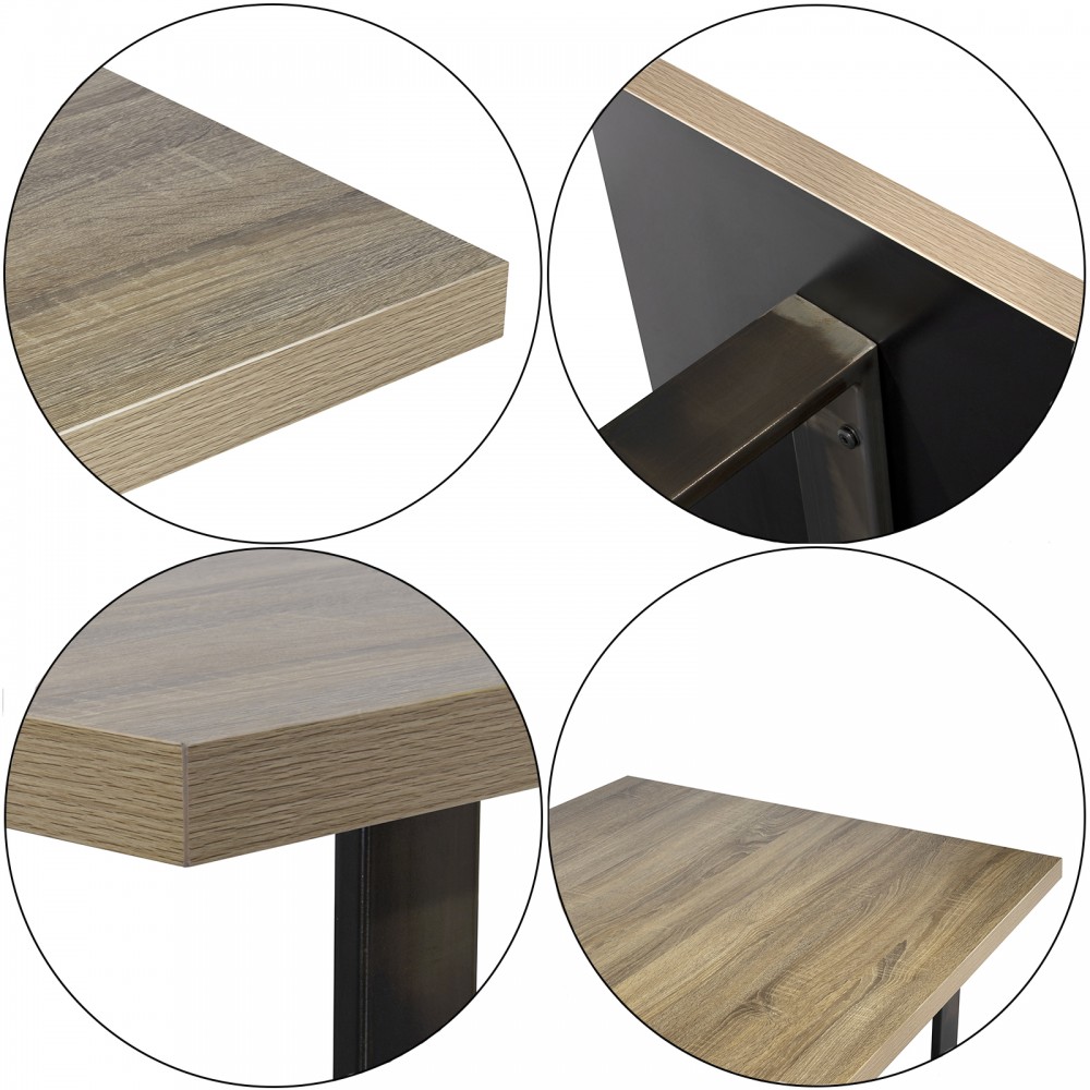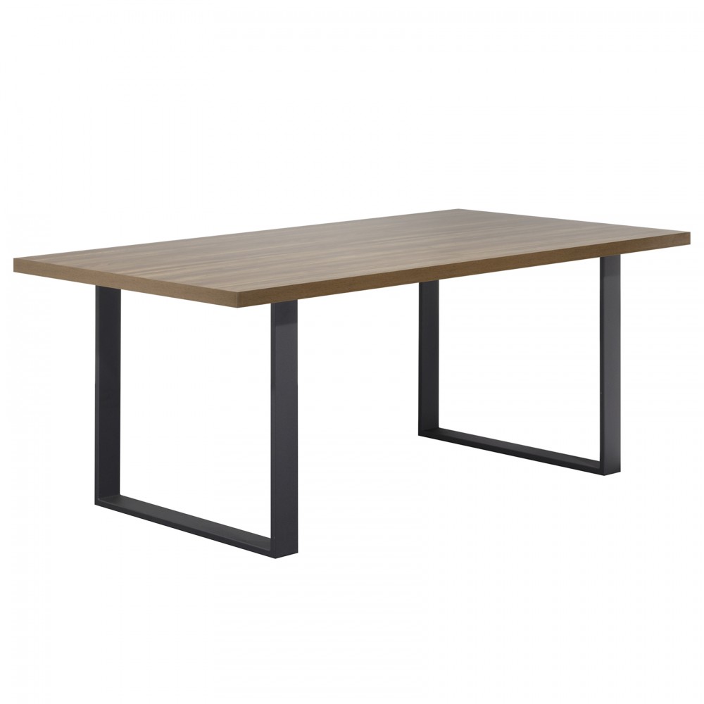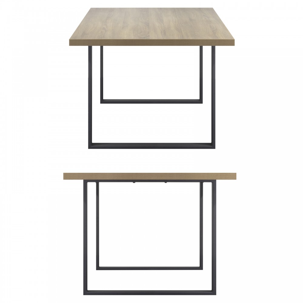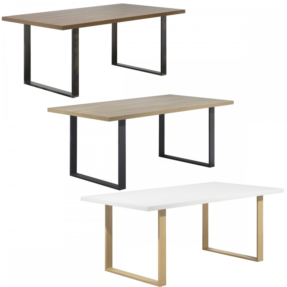 | bulletpointB | Plateau en MDF aspect chêne ou noyer, pieds en forme de U en acier noir ou avec une finition noir ou bois. |